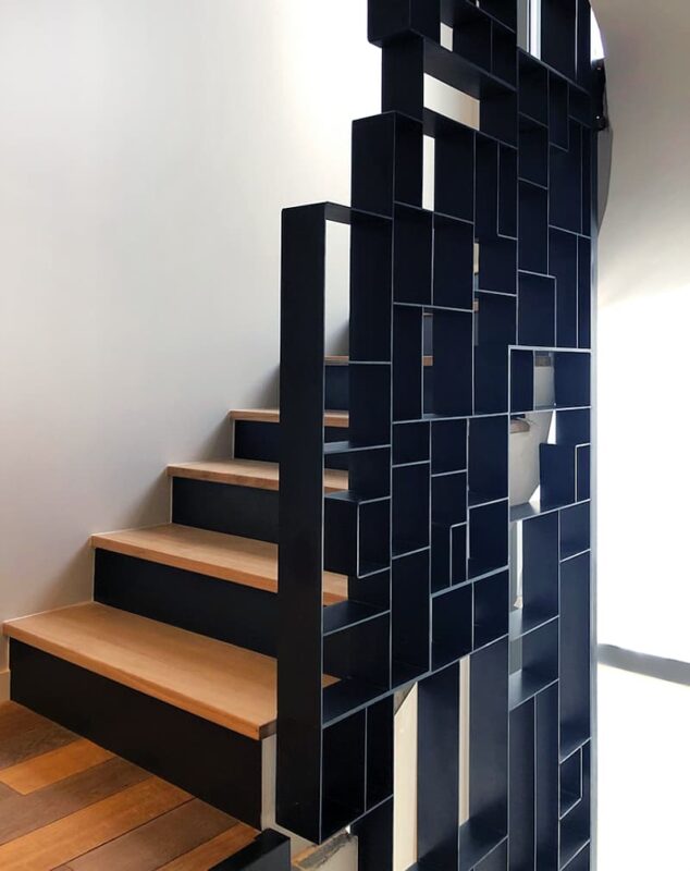 Лестница в стиле лофт на двойном ломаном косоуре из металлического листа 8мм. Косоур вырезан с косым рисунком. Ступени из дуба паркетной склейки как бы образуют вместе с подступенком букву Z. Перила из металлического профиля 40х20мм в стиле минимализм. Поручень из профиля 50х25мм. Покраска порошковая.