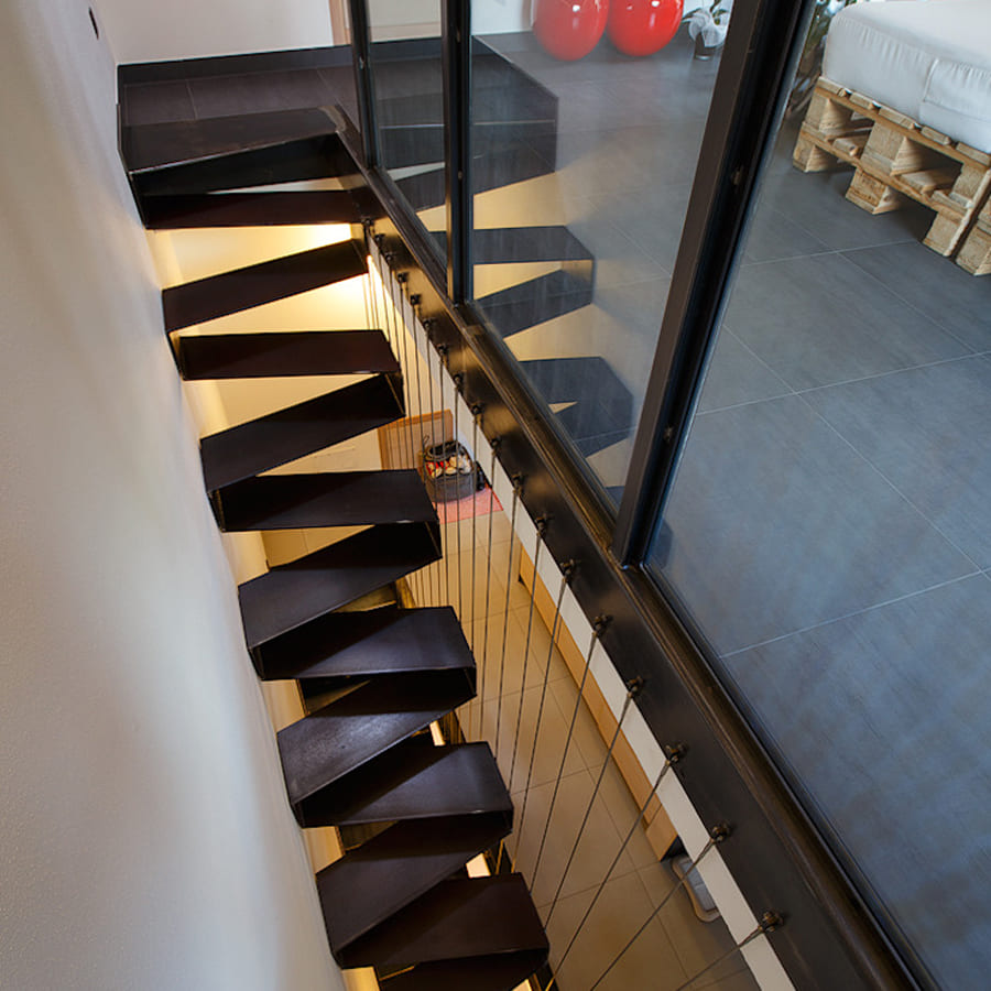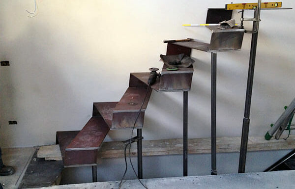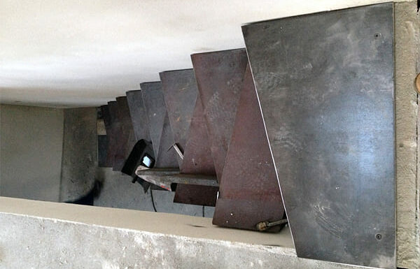 Делается из листа металла толщиной 6мм. В данной модели чернение металла и 2 слоя лака. Ограждения — трос нержавеющий ø5мм. Натяжение через кронштейны на ступенях.