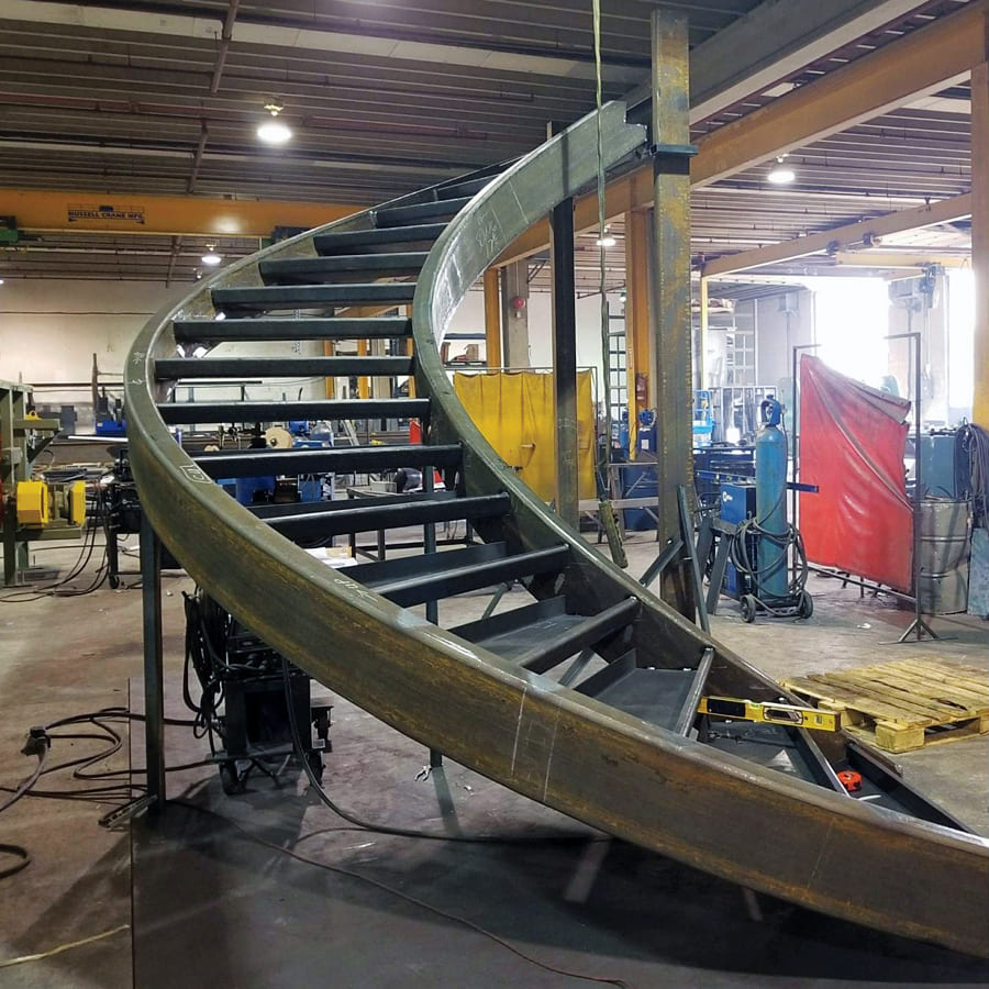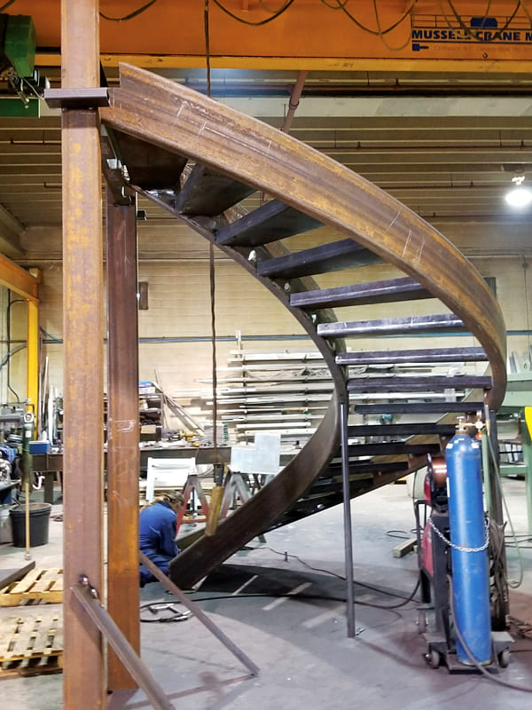 Конкретно в данном проекте лестница делалась как входная на второй этаж мини-гостиницы. Условием было сделать такую конструкцию без дополнительных опор. Крепление только в перекрытие второго этажа и в пол.