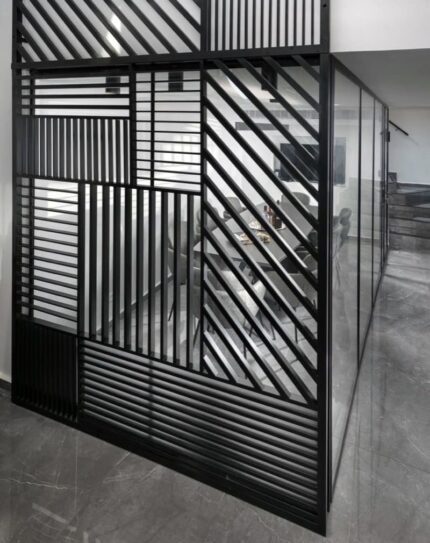 Стационарная лофт-перегородка сварная из металлического профиля и полосы. Перегородка с переменнным рисунком полос и профиля в разных квадратах. Подходит как для жилых, так и офисных помещений, торговых и выставочных залов.