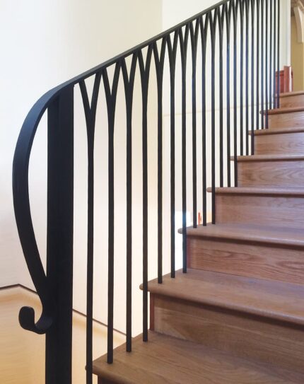 Перила с вертикальным арочным рисунком в стиле лофт-модерн. Данный вид металлических сварных перил подойдет для любых интерьеров. Внутреннее наполнение - арки из полосы 50х6мм. Поручень с шарнирными соединениями. Сделан из металлической трубы ⌀50мм. Перила покрашены порошковым способом.
