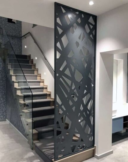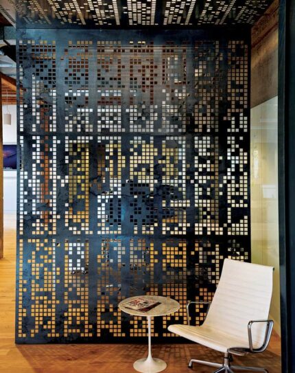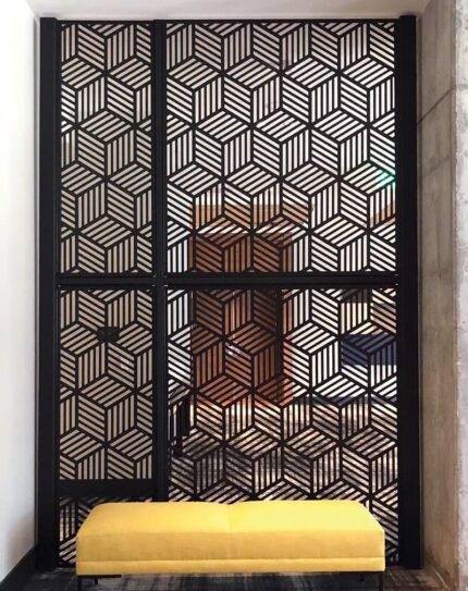 Сплошная лофт-перегородка из металлического листа 2,5мм. Рисунок в виде различных орнаментов и геометрических фигур нанесен лазерной резкой. Окантовка металлический профиль 20х20м. Стойки из профиля 40х40мм.