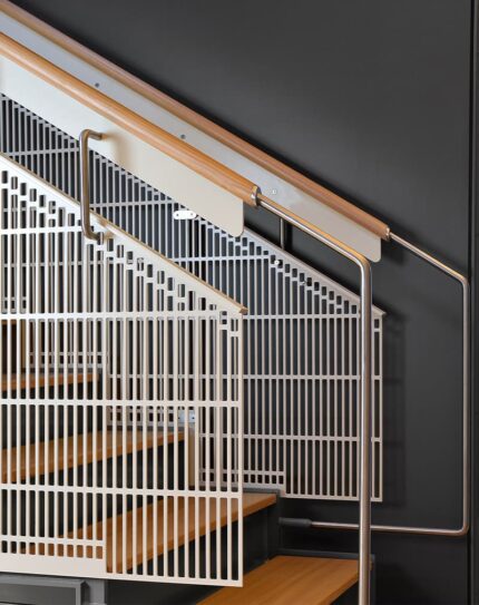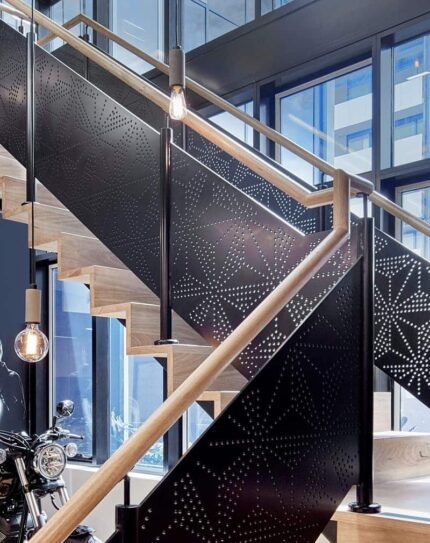 Стильные перила в стиле хай-тек с круглым деревянным поручнем. Основа из металлического листа 4мм с вертикальным рисунком, нанесенным лазерной резкой. Крепятся на внешнюю сторону лестницы. Круглый поручень из лиственницы. Элементы декора из нержавеющей трубы. Покраска порошковая.