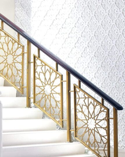 Перила металлические с резным дубовым поручнем. Сделаны из металлического профиля 40х20мм и листа 6мм с рисунком "снежинка", нанесенным лазерной резкой. Стойки из профиля 50х50мм. Крепятся на ступени лестницы. Подходят к классическим и бохо интерьерам. Покраска порошковая золото.