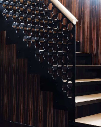 Перила металлические с деревянным круглым поручнем. Сделаны из металлического листа 8мм с рисунком в виде равномерно распределенных шестиугольников, нанесенным лазерной резкой. Крепятся на внешнюю сторону лестницы и перекрытий надежными анкерами. Поручень цилиндрический из сосны клееной. Прекрасно подойдут к лофт и индустриальным интерьерам. Покраска порошковая в любой цвет.