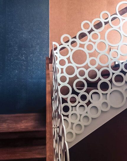 Перила лазерная резка с дубовым поручнем. Сделаны из металлического листа 8мм с рисунком в виде колец, нанесенным лазерной резкой. Крепятся на боковую поверхность лестницы. Поручень из массива дуба. Прекрасно подойдут к любым современным интерьерам. Покраска порошковая.