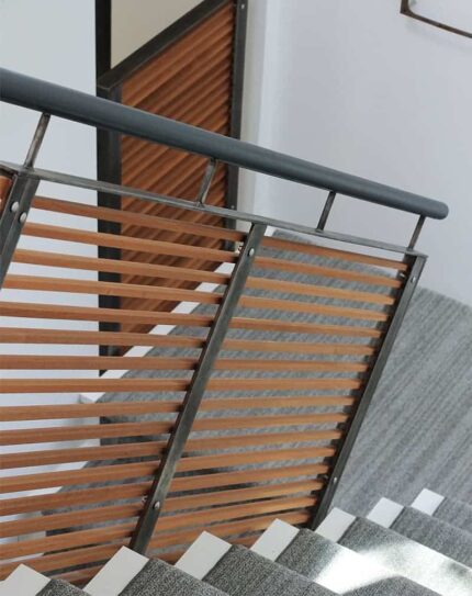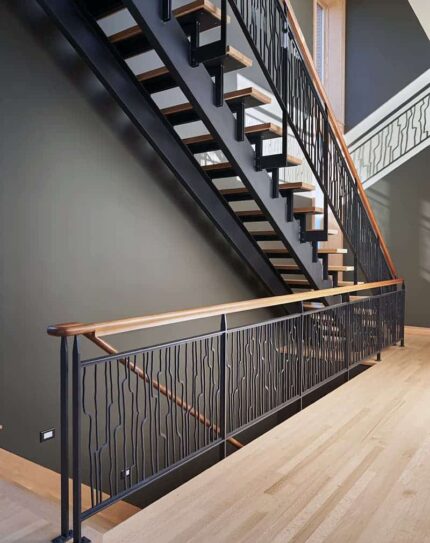 Перила в кантри стиле с деревянным поручнем. Сделаны из полосы и металлического листа 4мм с хаотичным рисунком, нанесенным лазерной резкой. Крепятся сбоку от лестницы. Поручень из сосны клееной. Прекрасно подойдут к любым интерьерам - от классики до лофта. Покраска порошковая.