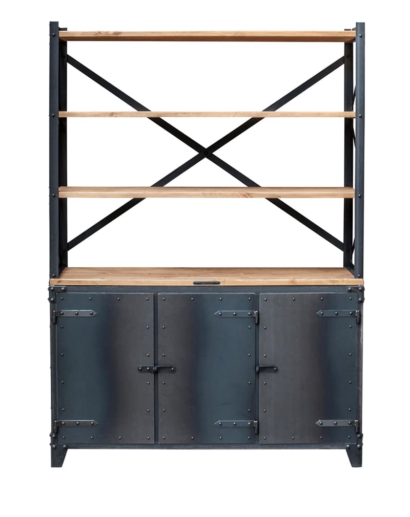 Буфет «Амбер» сделан на основе кухонного напольного шкафа «Амбер остров». Основа буфета из из стальных уголков, декоративных заклепок и металлического листа 3мм. В верхней части 4 полки из массива сосны по всей ширине буфета.