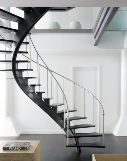 «Угол» — стильная и недорогая лестница в стиле минимализм. В силу конструкции занимает мало места в помещении и является практически незаметной. Полностью сварной каркас из металлического профиля и листа.