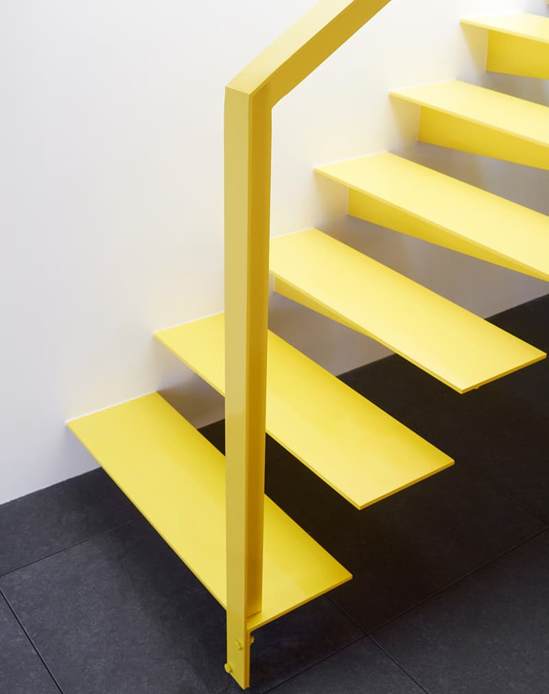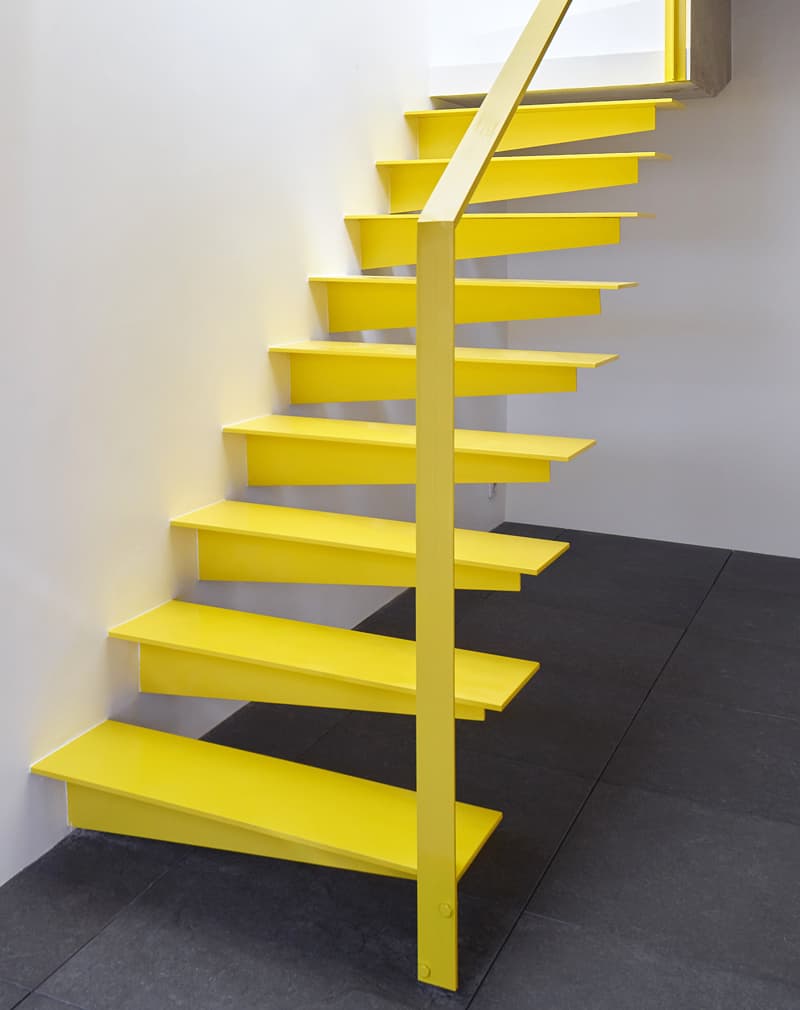 «Симпл» — это простая и яркая консольная лестница. Сделана из стального листа 10мм и металлического уголка 60х60мм. Ступени крепятся непосредственно в стену.