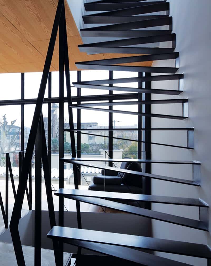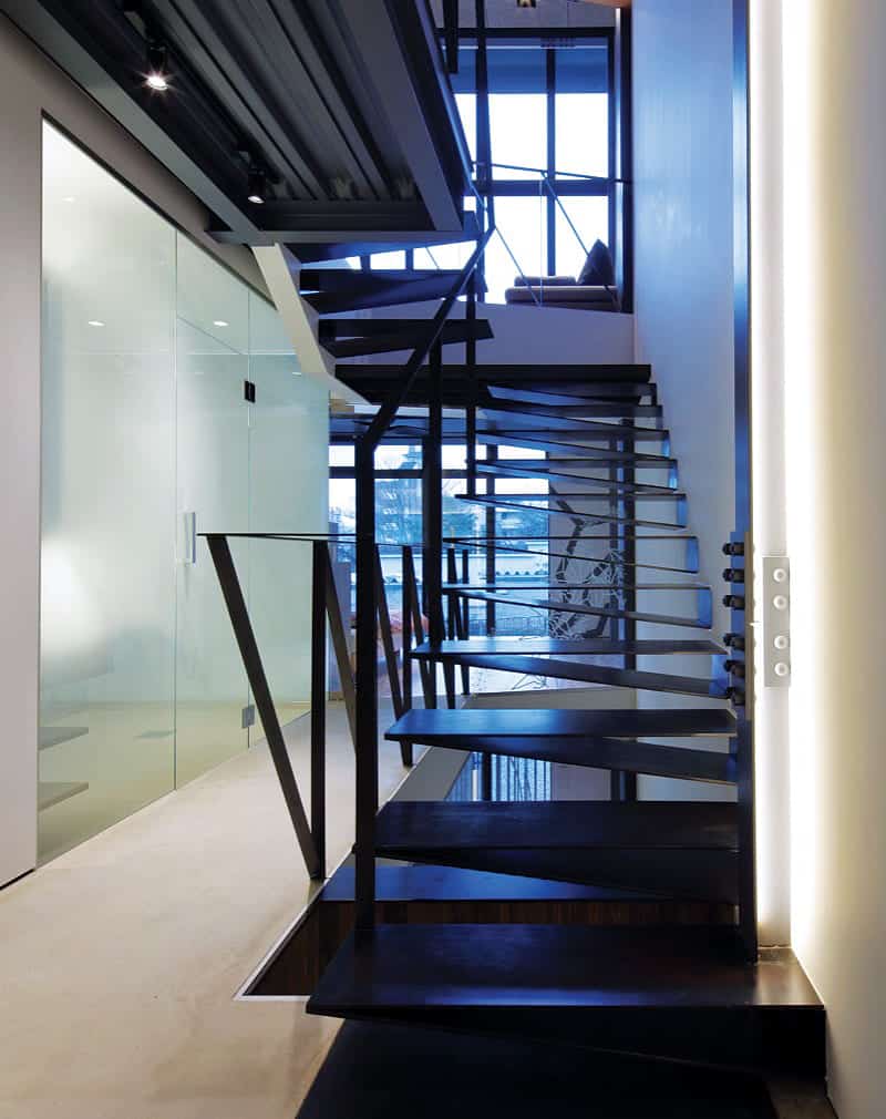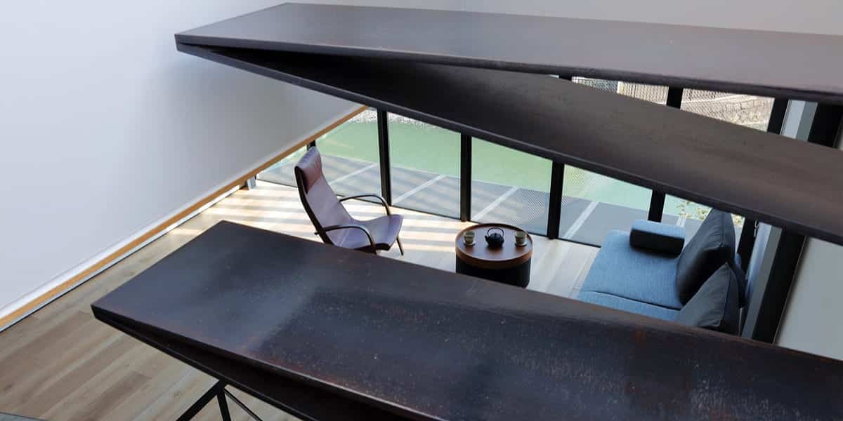 «Треугольник» — это стильная и необычная консольная лестница. Сделана из черненого стального листа 8мм и металлической полосы 40х8мм. Крепится к стене на анкера. Треугольная конструкция ступеней делает их надежными и прочными.