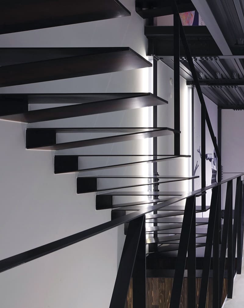 Лестница консольного крепления. Сделана в стиле сдержанного минимализма. Материал ступеней — металлический лист 8мм. Перила — металлическая полоса 40х8мм. Применено чернение металла. Требует крепления к стене. Может устанавливаться без перил.