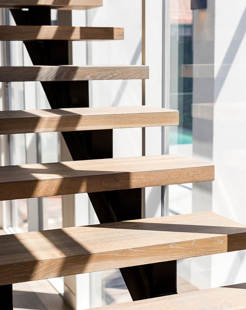 Лестница одномаршевая на двойном косоуре из профиля 100х100мм. Ступени дуб либо ясень цельноламельный. Перила на металлическом профиле со стеклом закаленным 8мм. Поручень дуб, ясень. Покраска лестницы порошковая.