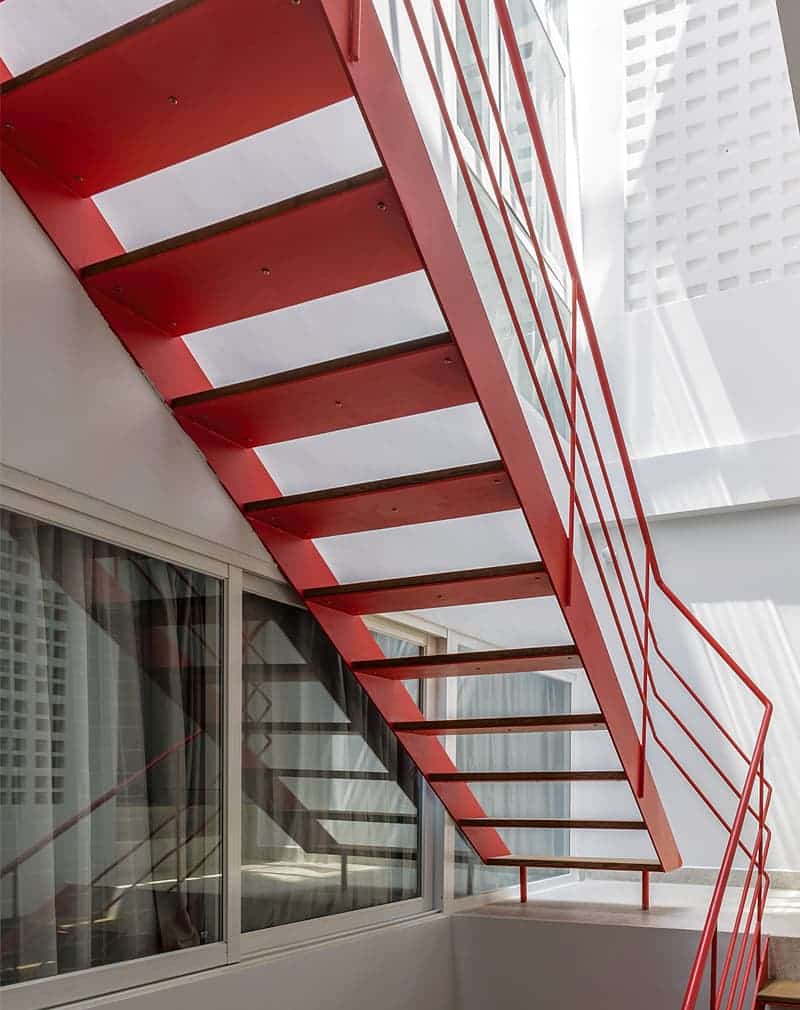 Лестница на простом металлическом каркасе. Сделана в стиле пожарной лестницы. Ступени-накладки из лиственницы. Такая индустриальная лестница подойдет к интерьерам минимализм, лофт, общественным помещениям.