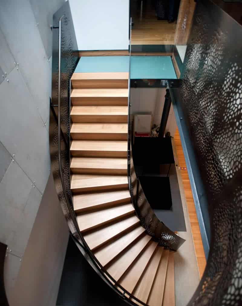 Лестница маршевая забежная на тетиве из металлического листа 8мм. Перила из металлических листов 5мм, собранных внахлест. Применена лазерная резка металла. Рисунок стилизован под змеиную кожу. Поручень труба ⌀40мм. Ступени и подступенки дуб 30мм. Покраска металла порошковая плюс патинирование.