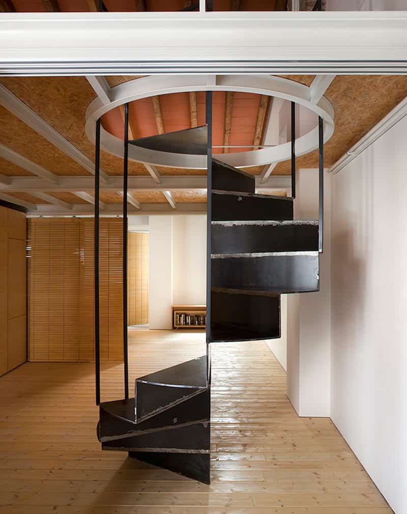 Лестница винтовая в духе лофт-минимализма. Каркас из металлического профиля 30х30мм металлического листа 8мм. Крепление потолочное. Из-за особенностей конструкции (отсутствие традиционных перил) подойдет для молодых людей без детей.