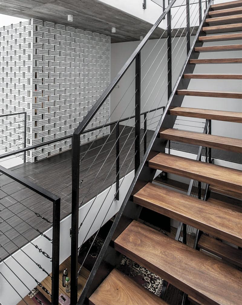 Лестница «Страйк»на каркасе из металлического листа 8мм. Ступени дуб массив, обработанный маслом и воском. Перила и поручни из профильных труб 40х20мм. Внутреннее наполнение трос стальной в прозрачной обмотке. Данная лестница не нуждается в боковом креплении к стене.