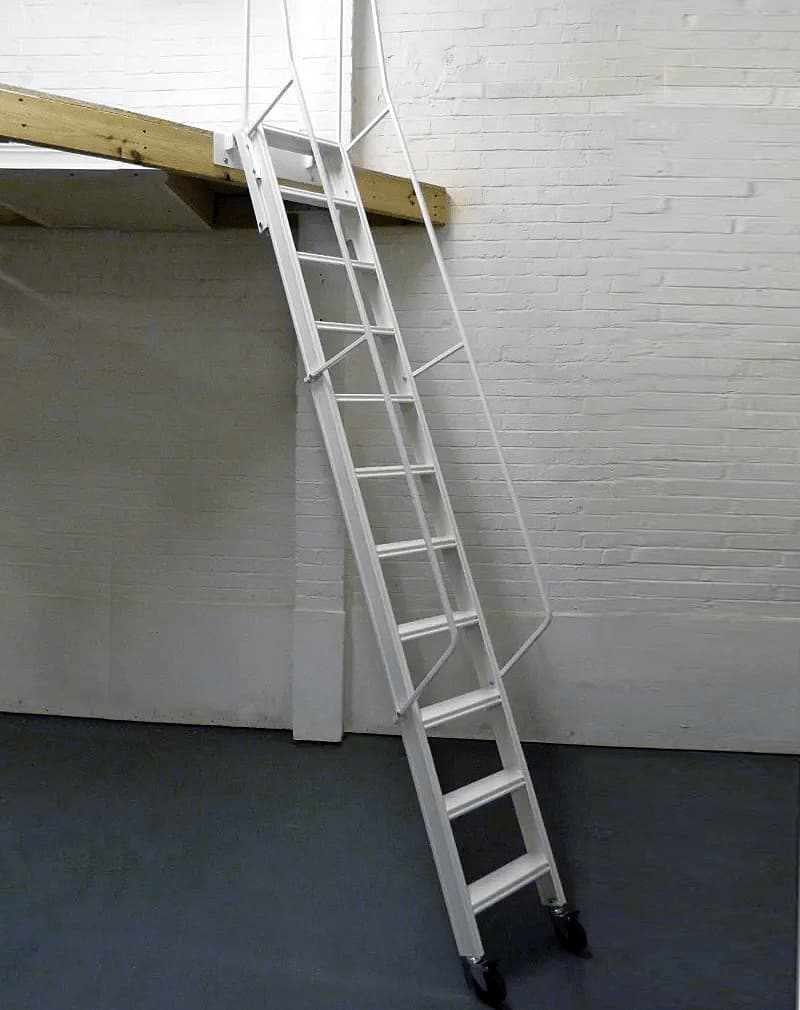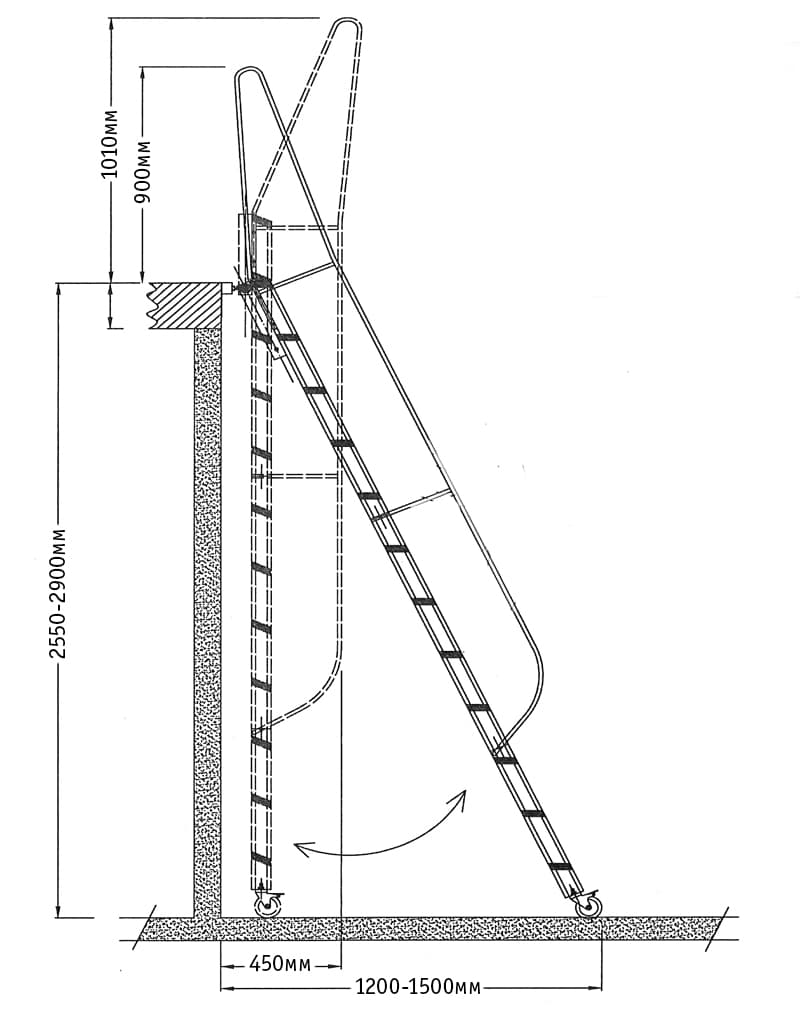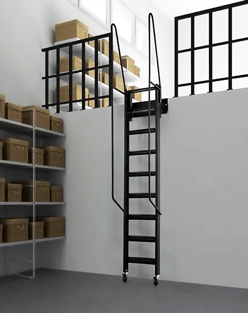 Лестница откатная антресольная металлическая лофт. Подходит для помещений с высотой потолка от 255 до 275см. Колесики с надежным стопором. Фиксирующий механизм в верхней части лестницы. Рабочая ширина откатной лестницы 600мм. Удобные съемные поручни из профиля 20х20мм в комплекте. Ступени профиль 60х30мм. Выдерживает нагрузку до 500 кг.