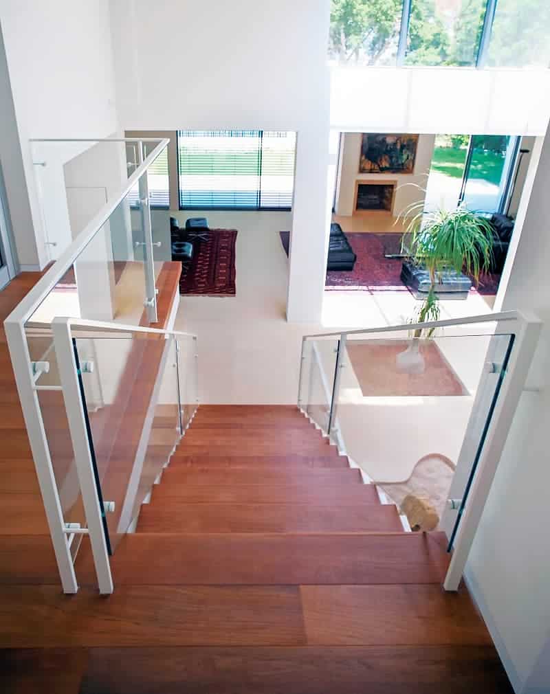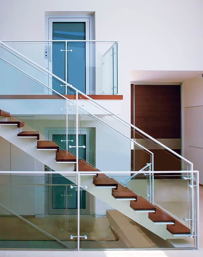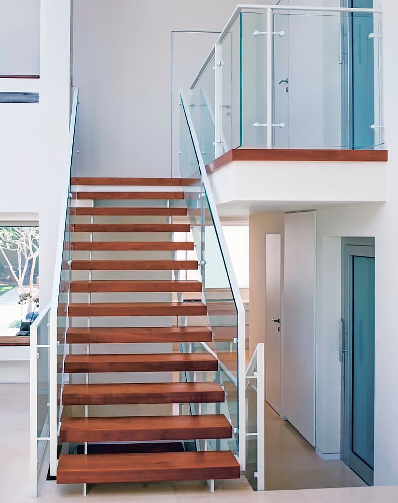Лестница маршевая в на двойном косоуре из листа металла. Ступени из массива дуба категории Премиум. Перила из стекла прозрачного закаленного на металлическом каркасе.