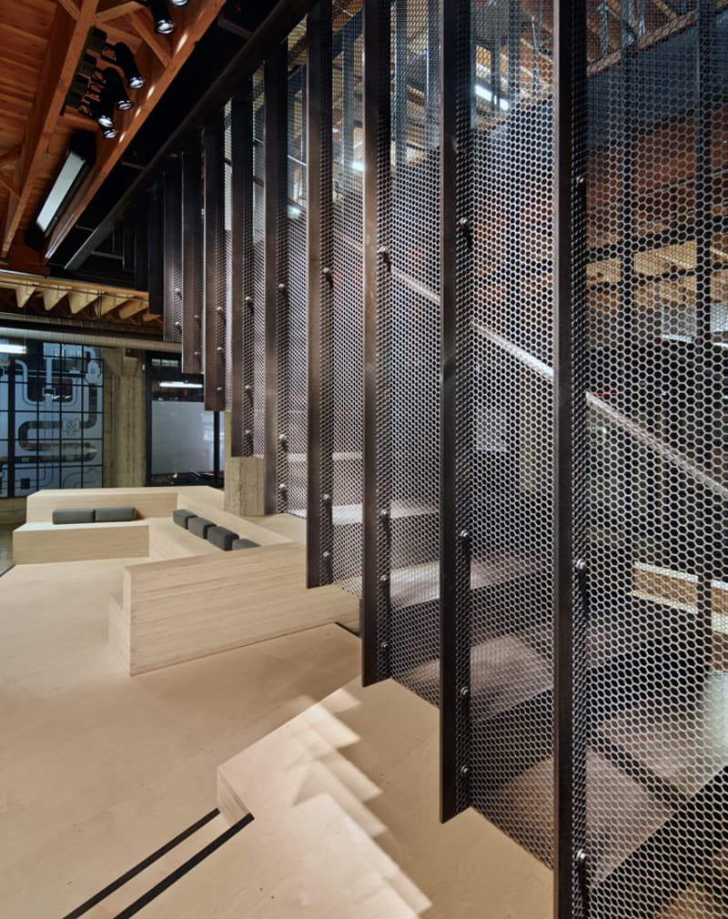 Лестница потолочная «Ион» имеет основу из металлического листа 8мм и обшита перфорированными сетчатыми панелями. Применено чернение металла. Покрытие лак бесцветный. Так лестница сохраняет металлическую текстуру.