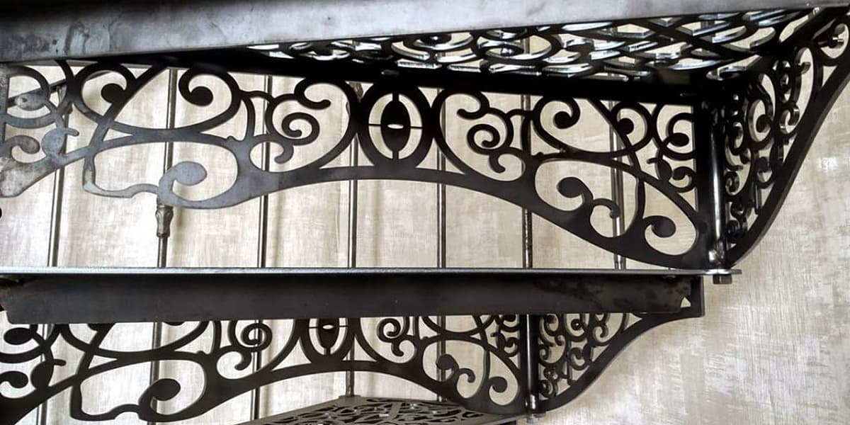 Тетива и ступени лестницы «Кружевная» сделана из металла 6мм с резным рисунком, нанесенным лазерной резкой. Балясины перил вертикальные с элементами ковки. Поручень фигурный итальянский. Покраска чернение или порошковая.