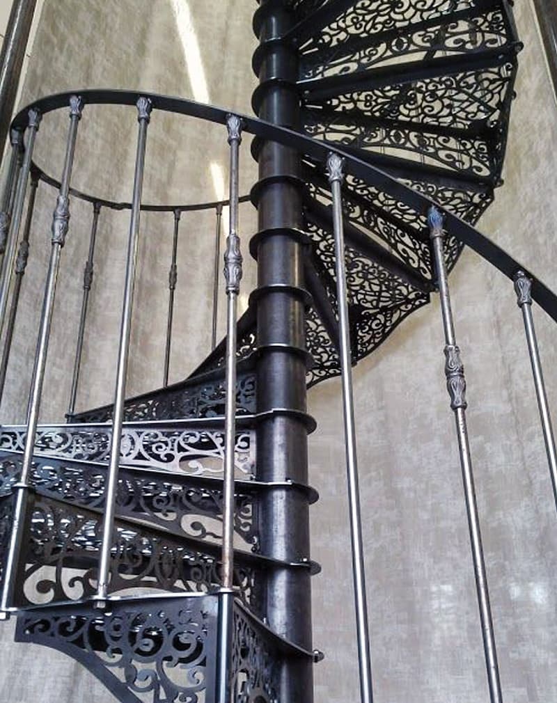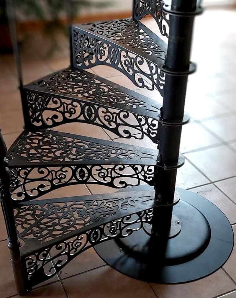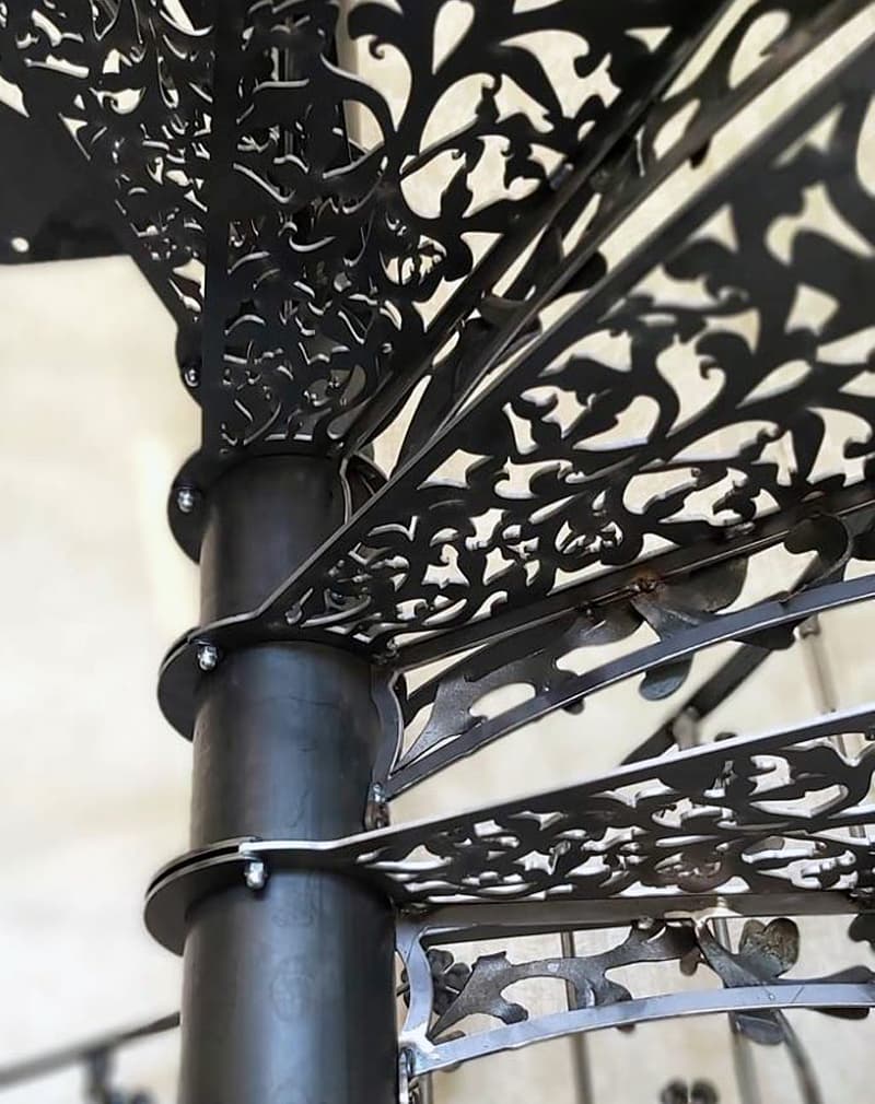 Лестница винтовая металлическая лазерная резка «Кружевная». Ступени и подступенки из металлического листа 6мм с резным рисунком, стилизованным под чугунные викторианские лестницы 19-го века. Однако в отличии от чугунных лестниц, стоимость данной лестницы с лазерной резкой металла в 2 раза ниже. Перила из трубы ⌀20мм с резными коваными элементами. Поручень итальянский.