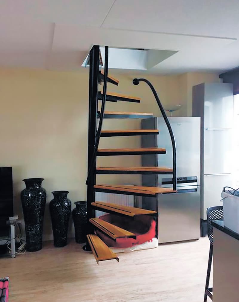 Может быть установлена в любом месте помещения. Компактный размер позволяет установить ее даже в небольшом чулане. При этом ширина ступеней останется комфортной — более 100см. Монтируется в течении одного дня. Вы можете выбрать любой цвет для этой лестницы. Покраска порошковая.
