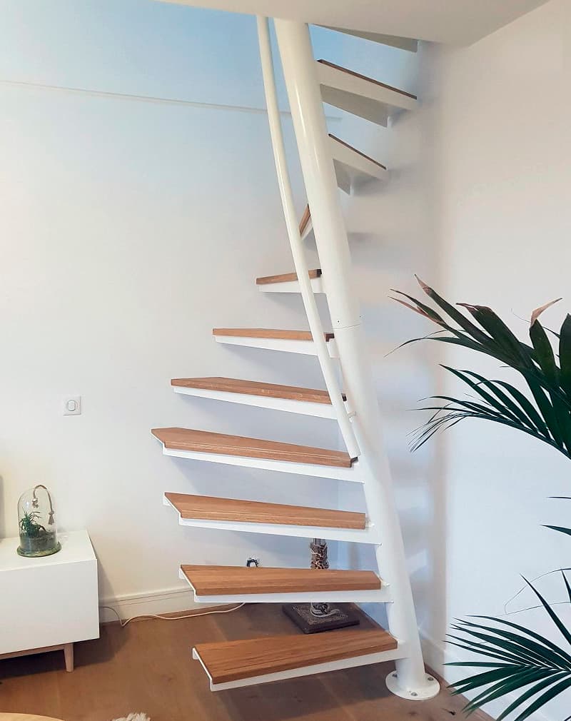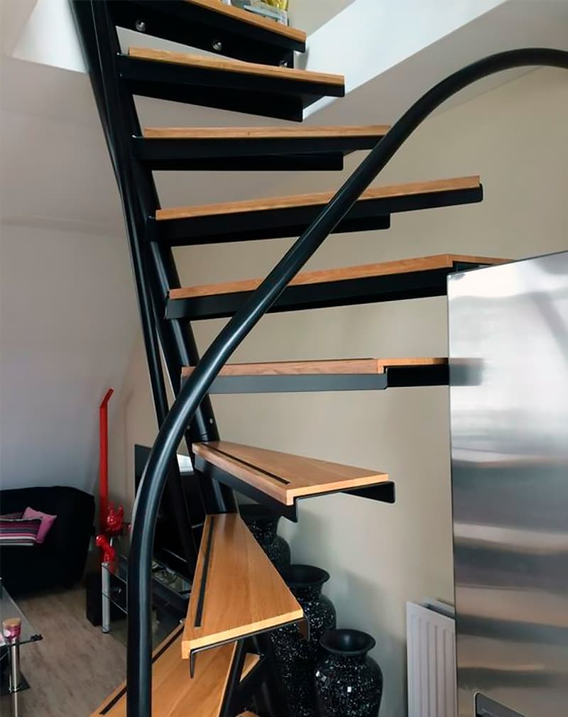 Лестница винтовая компактная с наклонной опорной стойкой. Несущая труба ⌀102мм. Ступени из гнутого металлического листа приварены к основе. На ступенях деревянные г-образные накладки из лиственницы толщиной 18мм. Подходит к любым современным интерьерам.