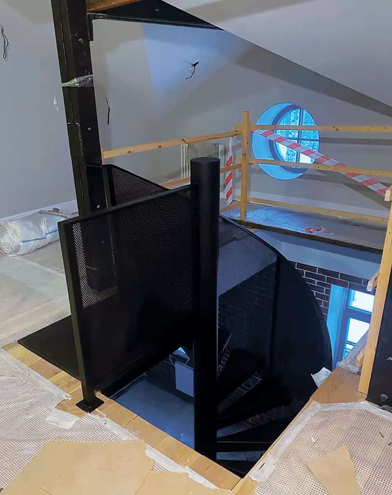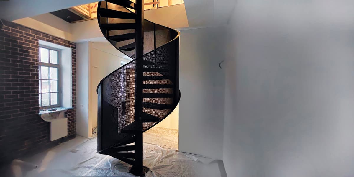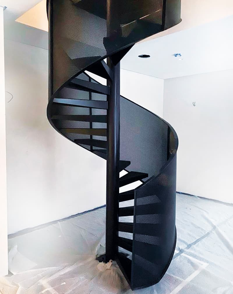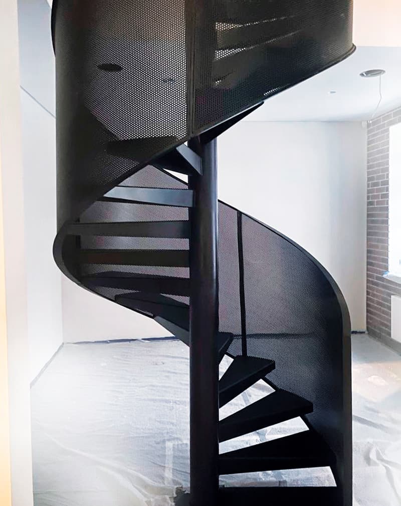 Лестница винтовая металлическая «Перфекто». Основа из мощной трубы ⌀150мм. Гнутые ступени из металлического листа 5мм. Основа перил из полосы 40х8мм, наполнение перфорированный лист 3мм. Покраска порошковая. Прекрасно впишется в интерьеры лофт, сканди, классика.