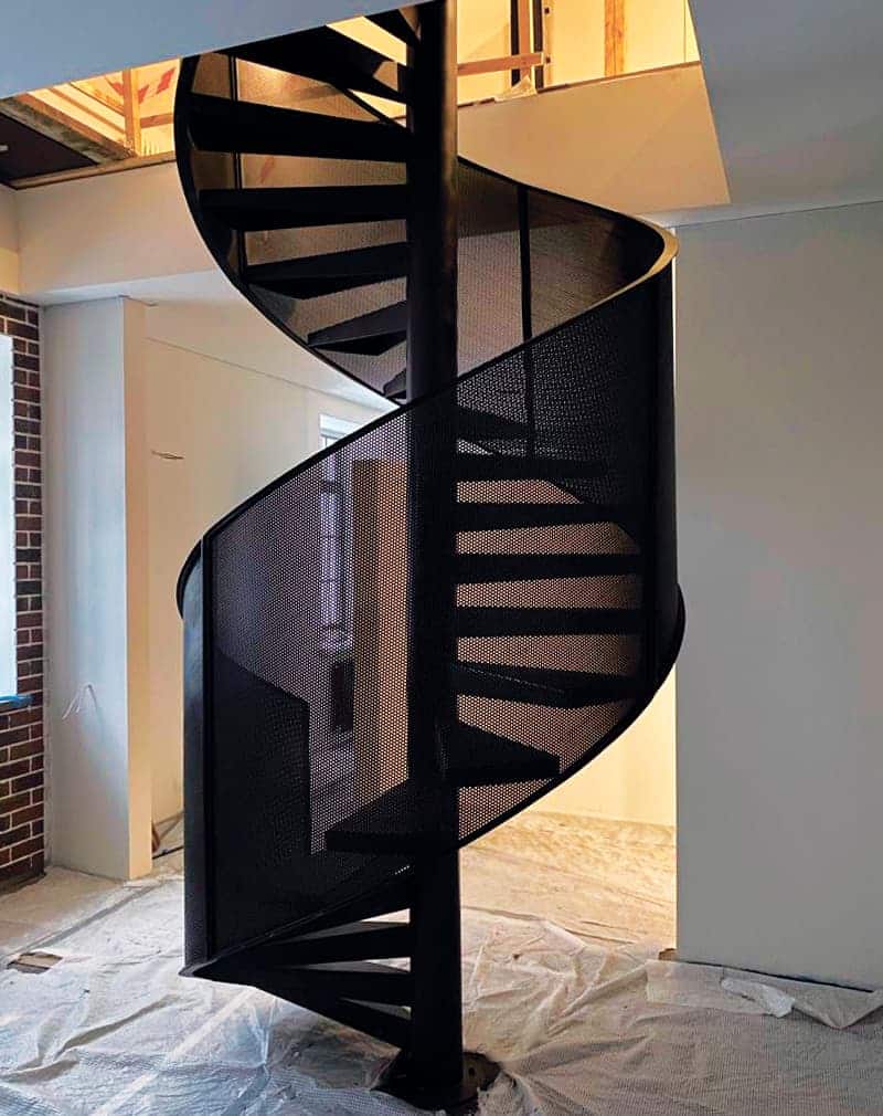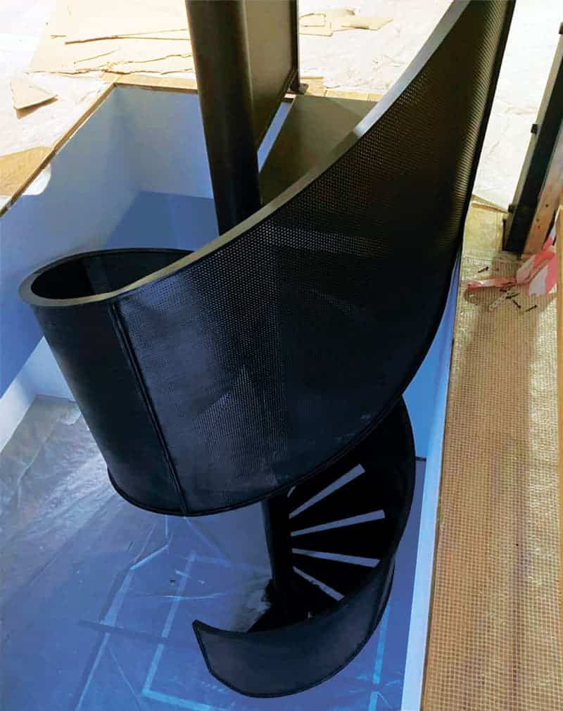 Перла лестницы винтовой «Перфекто» сделаны из перфорированного листа Rv 5-9 толщиной 3мм. Основа из толстой трубы ⌀150мм. Ступени из металлического листа.