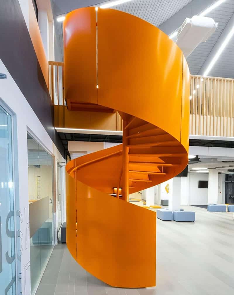Лестница винтовая «Спираль» изготовлена из металлического листа 5мм и стальной трубы ⌀110мм. Может быть установлена в любом месте помещения. Крепления к стене не требует.