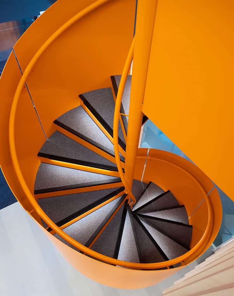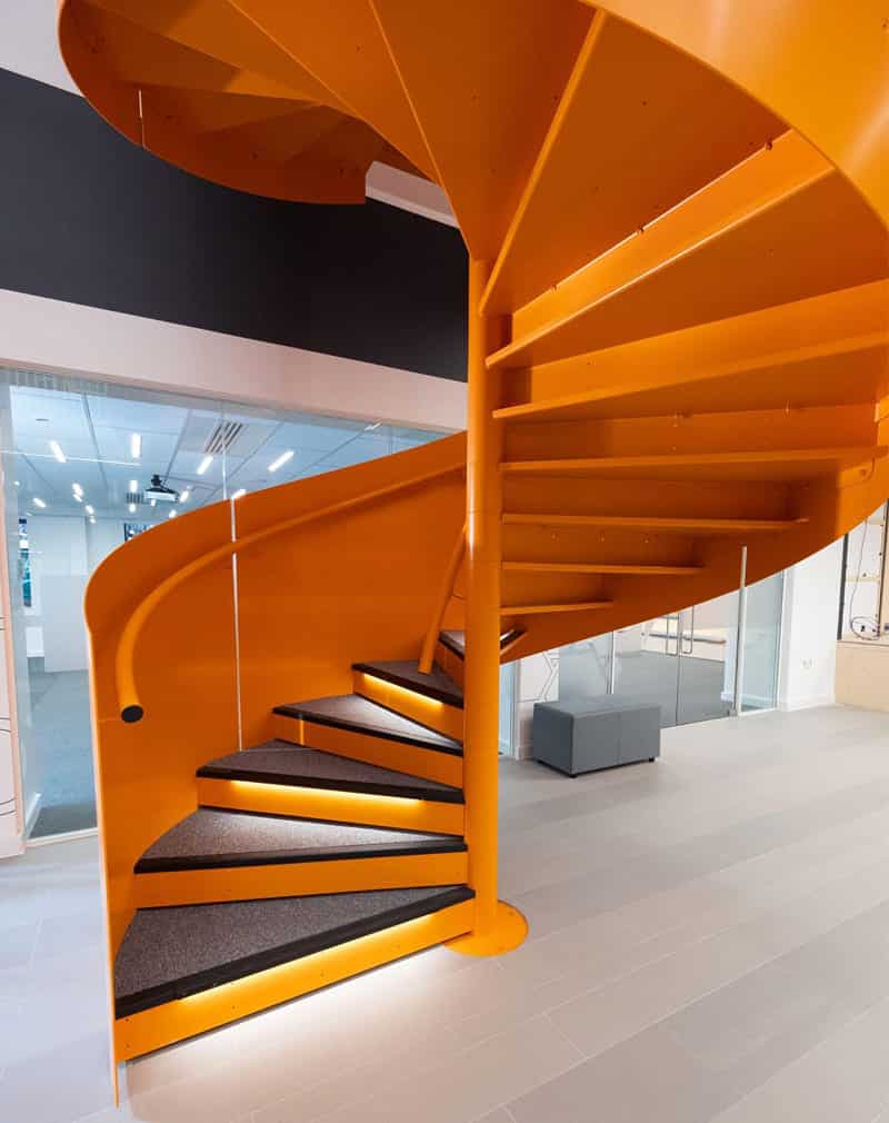Лестница винтовая «Спираль» сделана полностью из металла. Ступени металлический лист 5мм. Основа из стальной трубы ⌀110мм. Перила из металлического листа 2,5мм. Поручень труба ⌀35мм. Ступени покрываются синтетическим ковролином и резиновыми накладками. Подсветка ступеней по желанию.