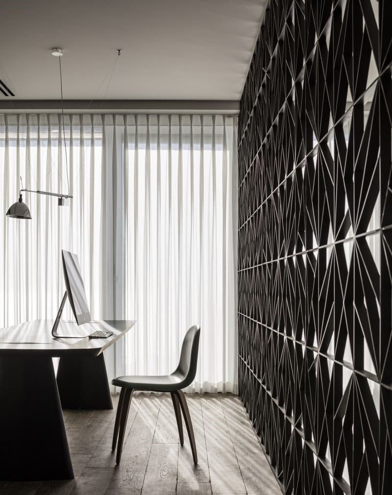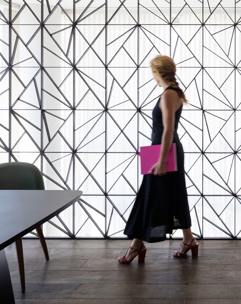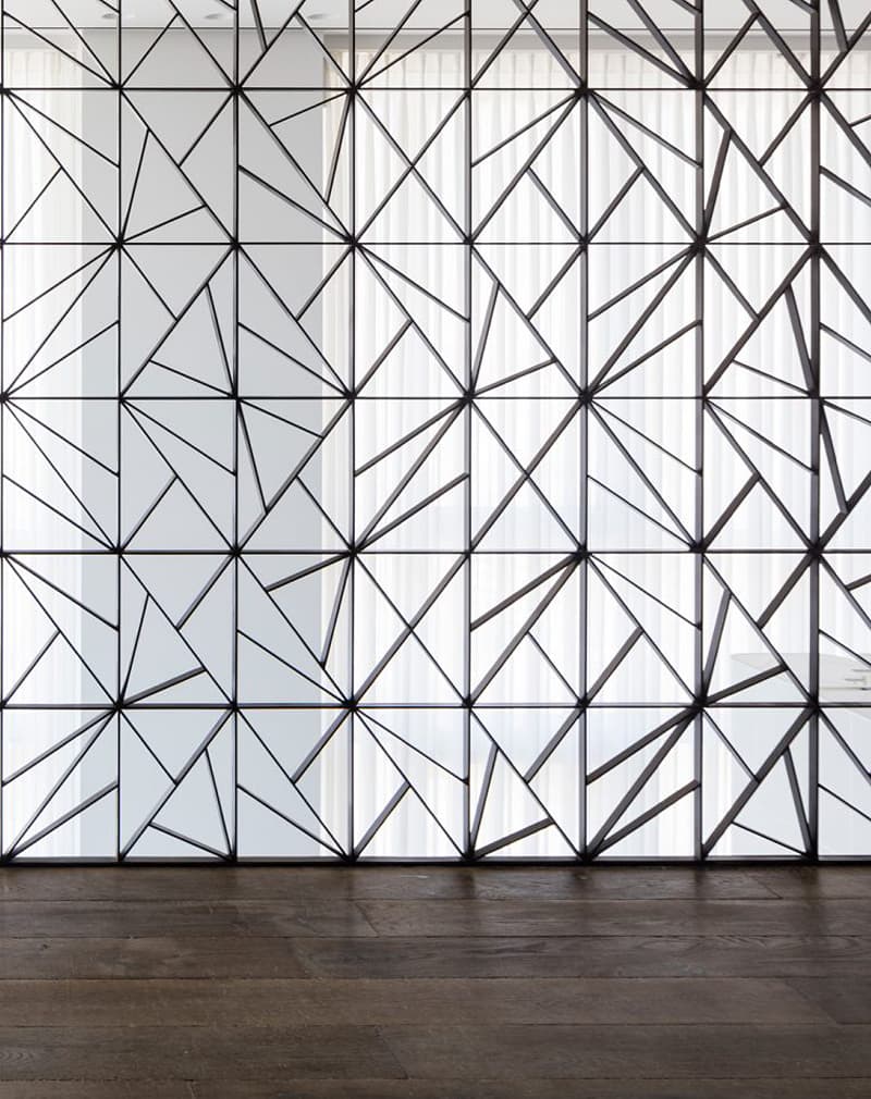 Лофт-перегородка «Геометрия» подходит для разграничения как офисных, так и жилых пространств. Металлическая полоса 40х8мм сварена сложным геометрическим рисунком. Перегородка стационарная, прочная. Может быть установлена как сплошное ограждение для многоуровнего помещения.