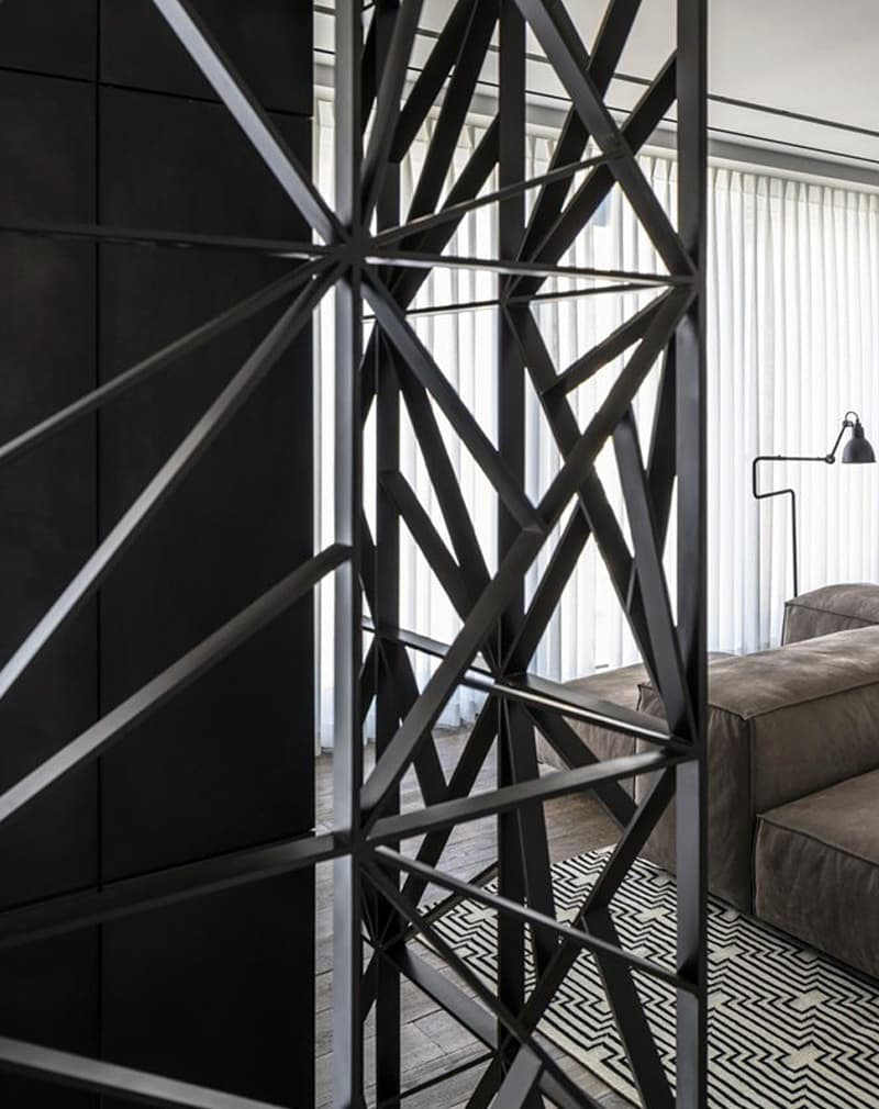 Стационарная лофт-перегородка сварная из металлической полосы 40х8мм. Геометрический рисунок перегородки позволяет разделить квартиру, дом или офис, оставляя зрительное пространство широкого или многосветного помещения. Плюс служит надежным металлическим ограждением в многоуровневом здании. Два в одном — перила и перегородка.
