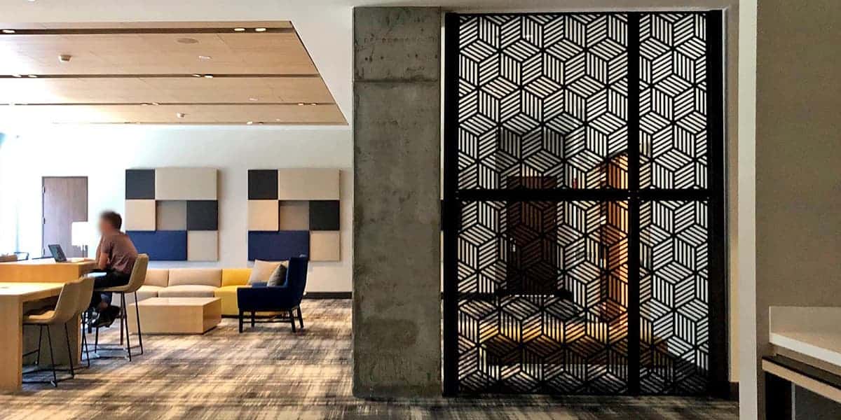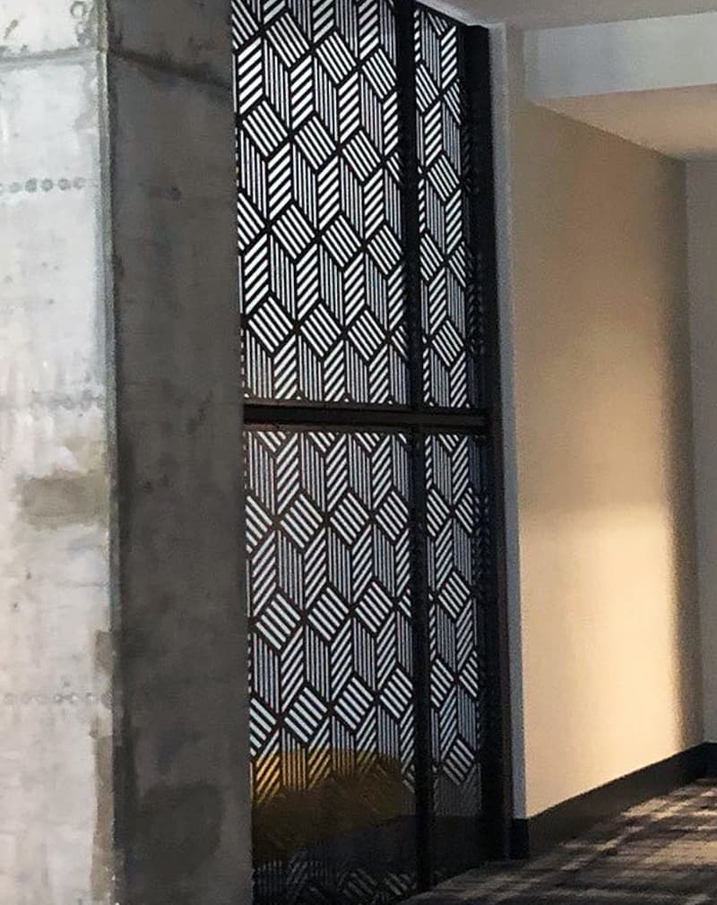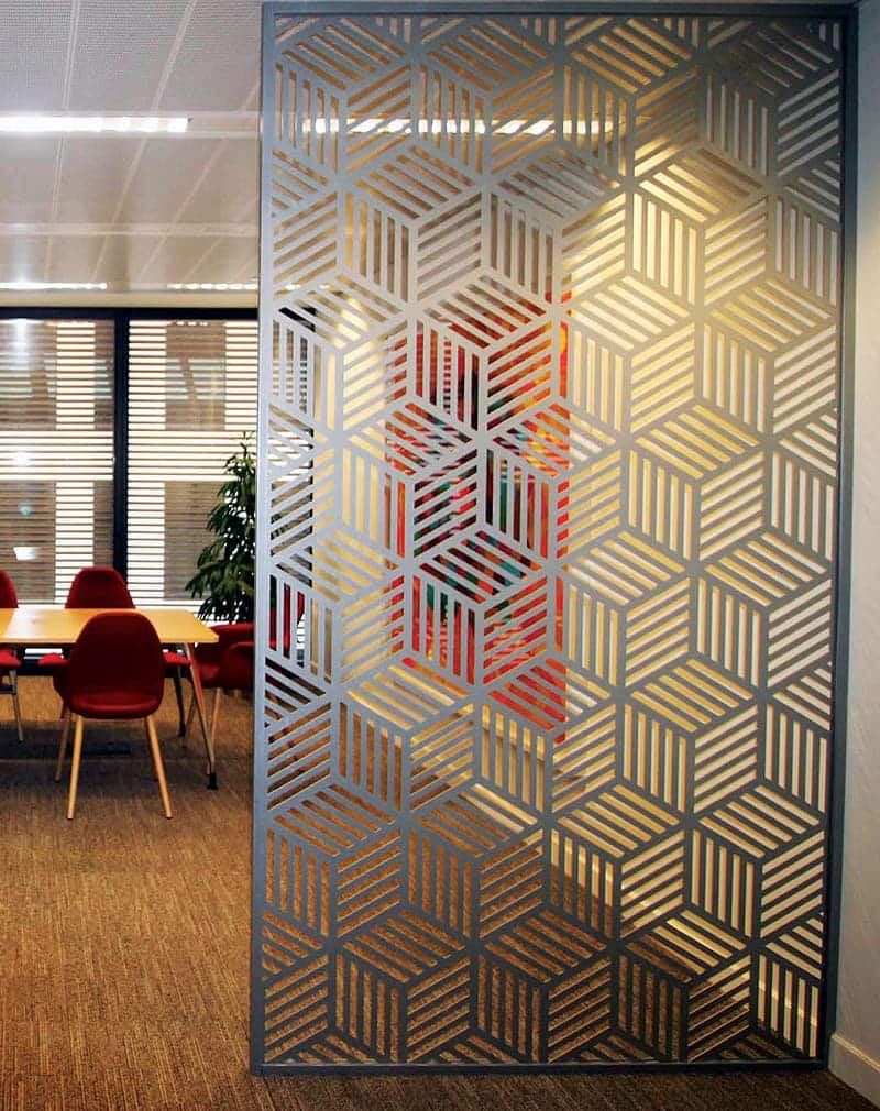 Такая лофт-перегородка подходит для визуального разграничения помещения. Лазерная резка равномерный кубический 3D рисунок. Металл придает ощущение основательности и надежности.