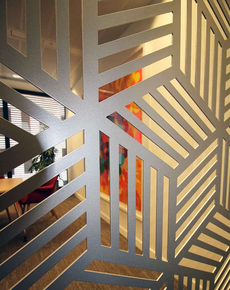 Сплошная лофт-перегородка из металлического листа 2мм. Геометрический 3D-рисунок в виде кубов сделан лазерной резкой. Окантовка металлический профиль 40х40мм либо 40х20мм. При необходимости соединяются между собой на стойках.