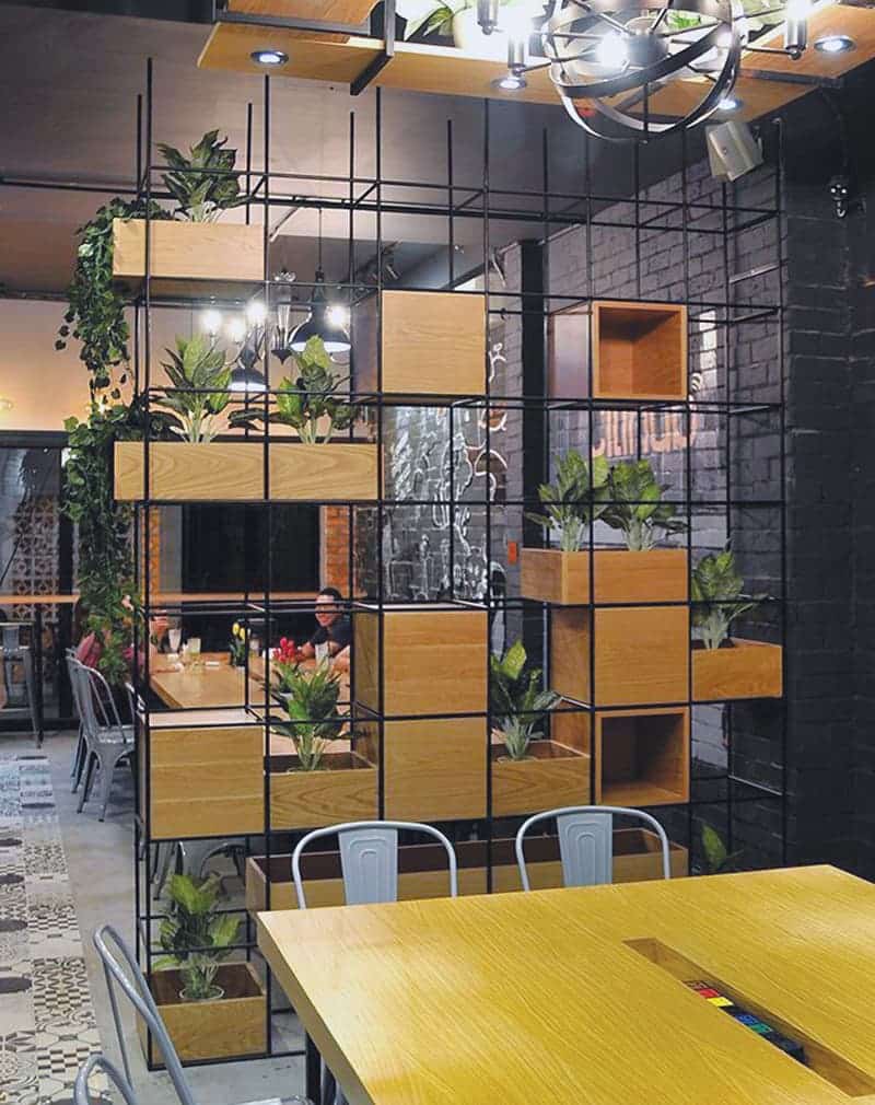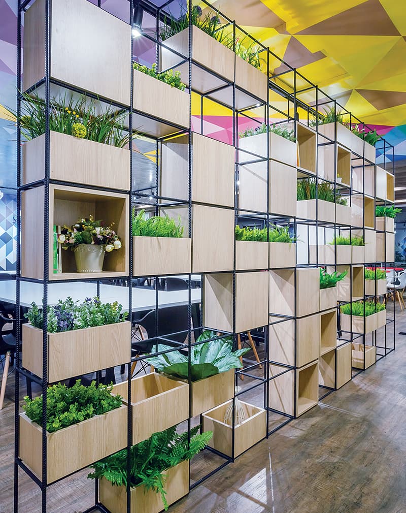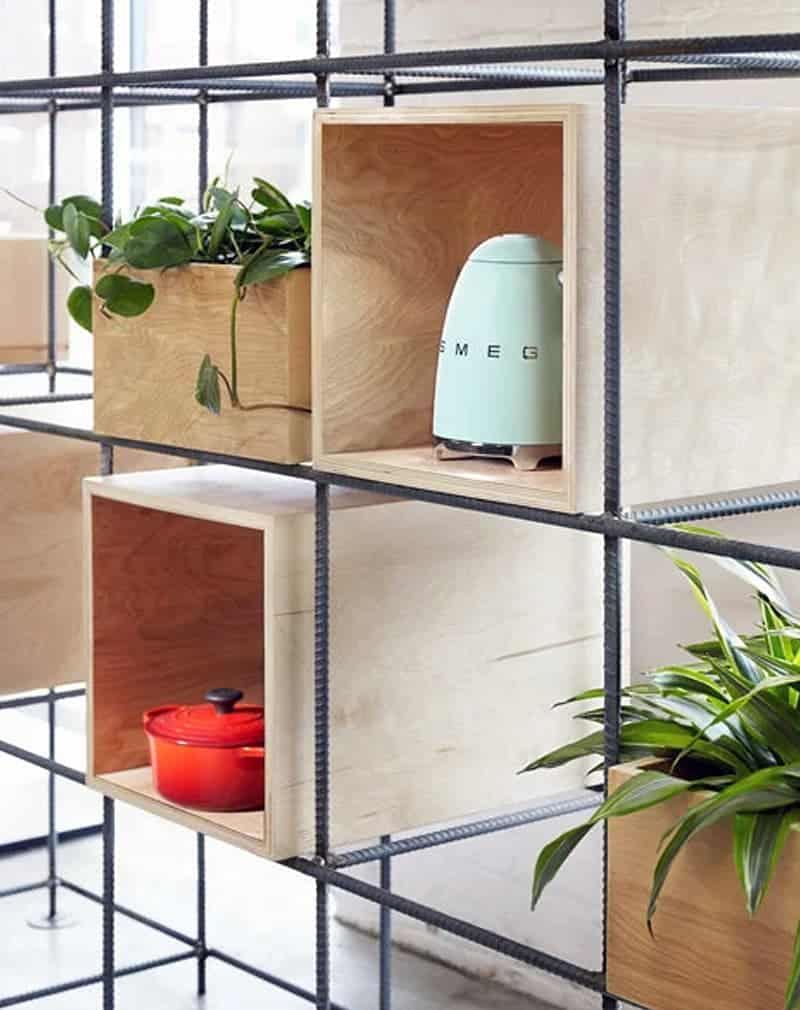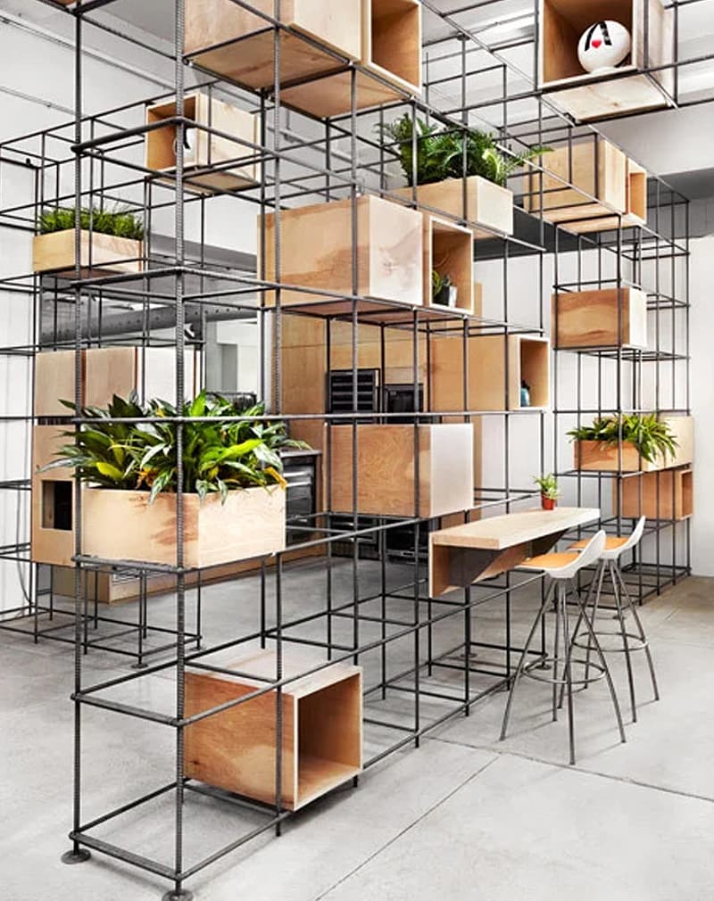 Стационарная перегородка сварная из металлической арматуры Ø18мм. Сделан в виде этажерки с квадратными модулями для хранения. В арматурный каркас вставляются кубические или полукубические открытые модули из фанеры/МДФ. Модули могут использоваться как для хранения или для украшения дома/офиса растительностью . Два в одном — стеллаж и перегородка.