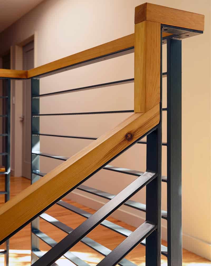 Металлические сварные перила с горизонтальным рисунком из полосы. Монтируются в пол и ступени. Либо в торец лестницы. Поручень брус из клееной сосны 50х40мм.