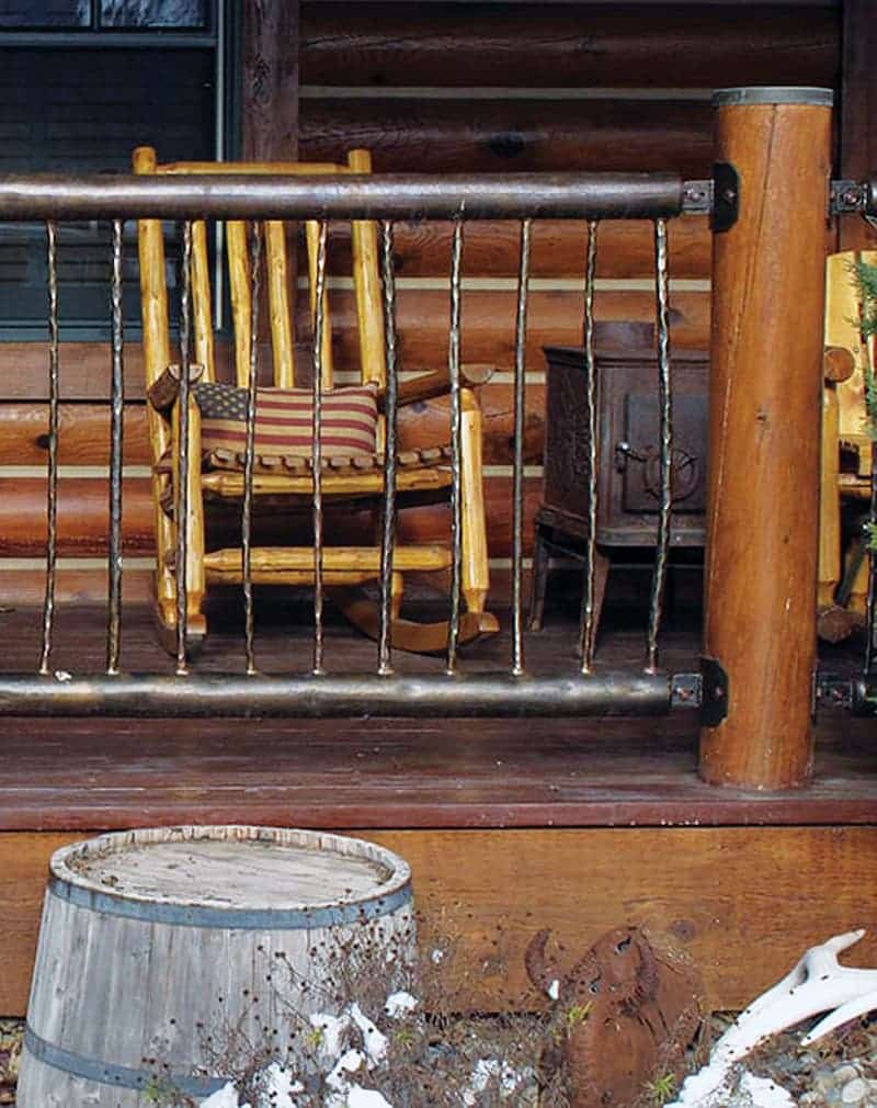 Перила металлические на стойках из оцилиндрованного бревна. Внутренний рисунок вертикальный из металлического художественно гнутого прута. Поручень из трубы.