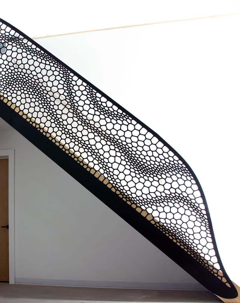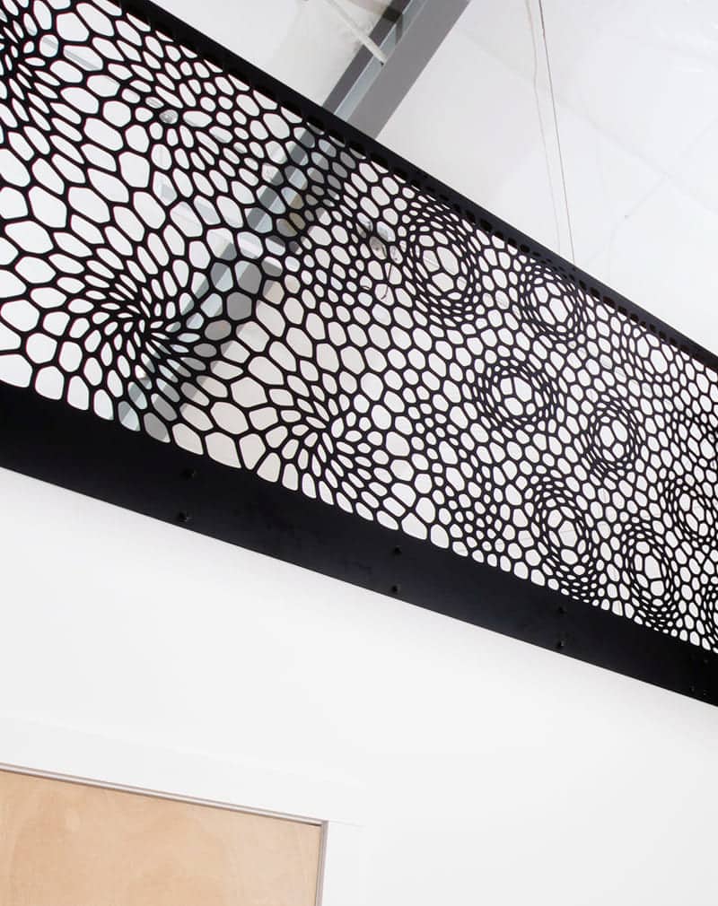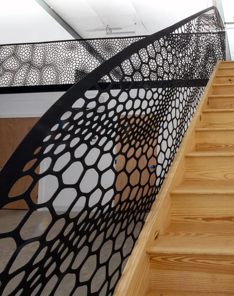 Перила сделаны из металлического листа 5мм, на котором с помощью лазерной резки нанесен рисунок. Такие изображения вы можете помнить из уроков биологии. Это срезы различных растений под микроскопом. Просто выполненные в черно-белом цвете. Поручень профильная труба 40х40мм.
