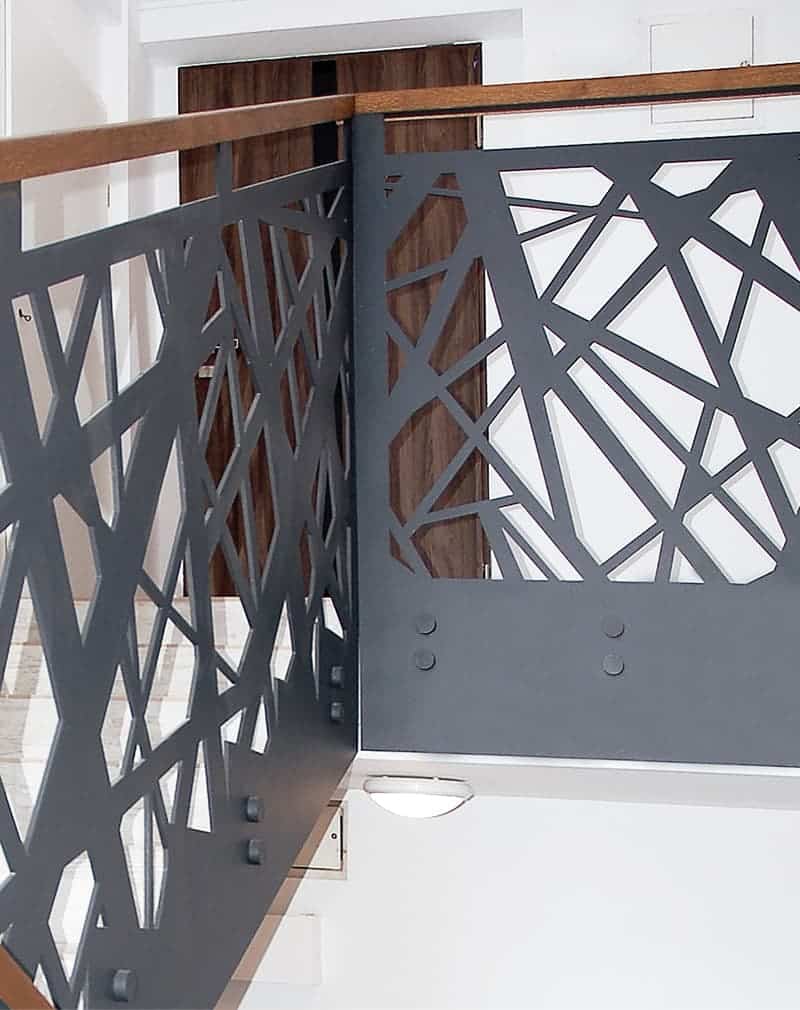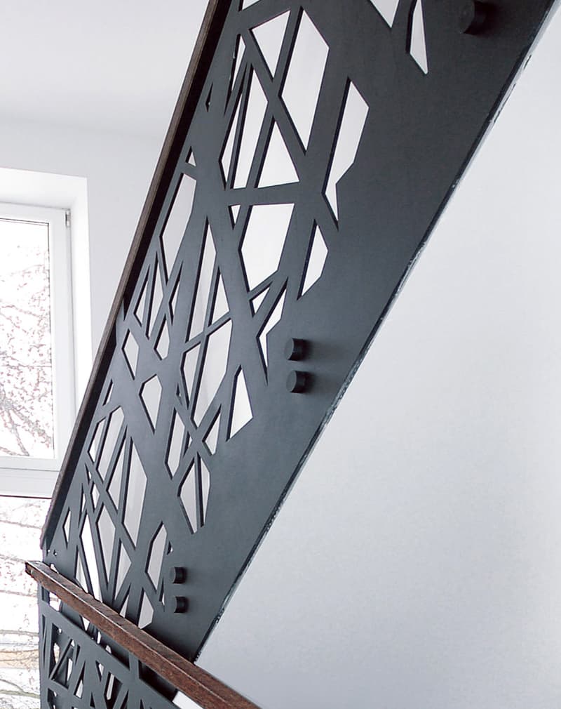 Перила сварные в лофт-стиле из металлического листа 6мм, на который путем лазерной резки нанесен хаотичный геометрический рисунок. Поручень из сосны клееной, покрытой маслом и воском. Крепятся на внешнюю сторону лестницы и перекрытий точечными металлическими держателями.