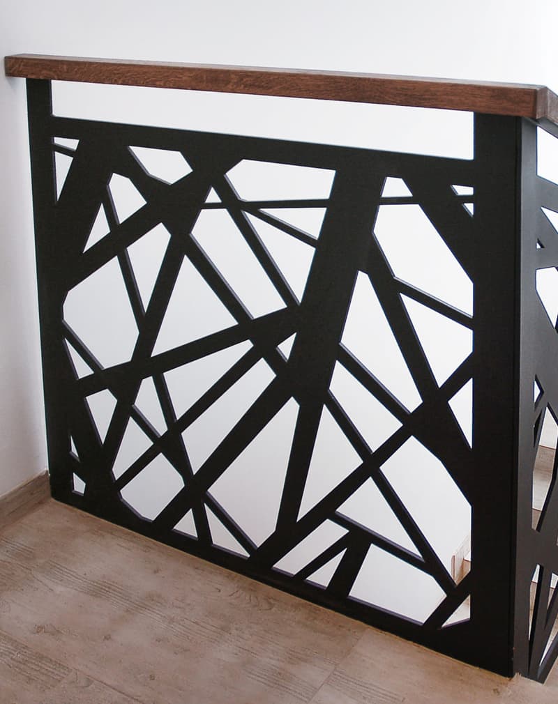 Перила металлические с деревянным поручнем. Сделаны из металлического листа 8мм с хаотичным геометрическим рисунком, нанесенным лазерной резкой. Крепятся на внешнюю сторону лестницы и перекрытий надежными точечными креплениями. Поручень из сосны клееной. Прекрасно подойдут к лофт и индустриальным интерьерам. Покраска порошковая.
