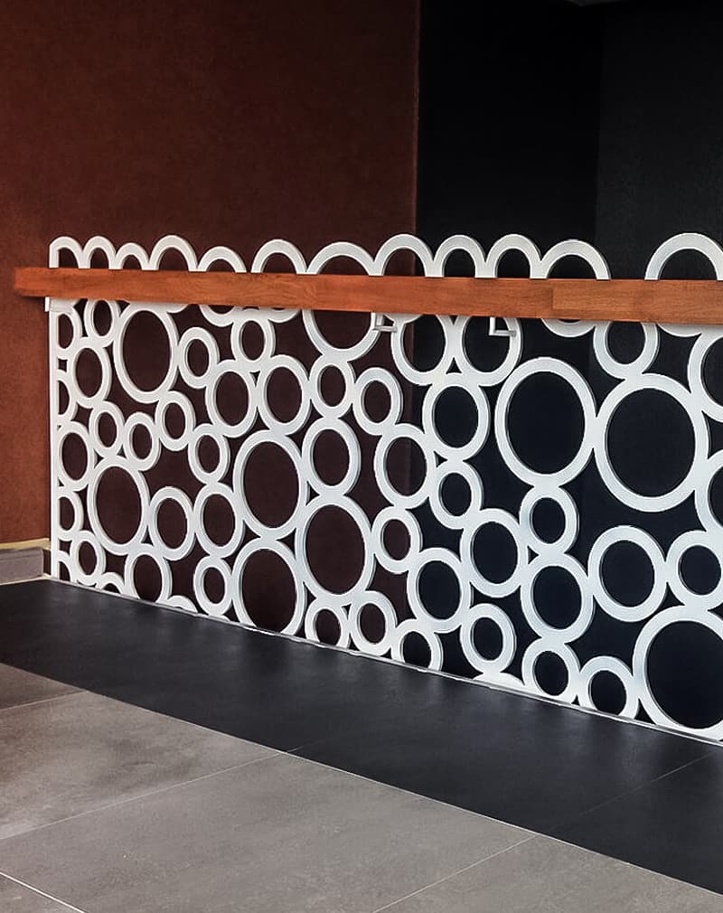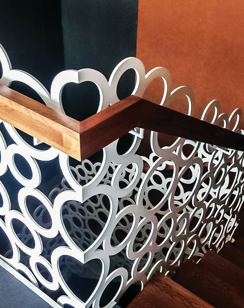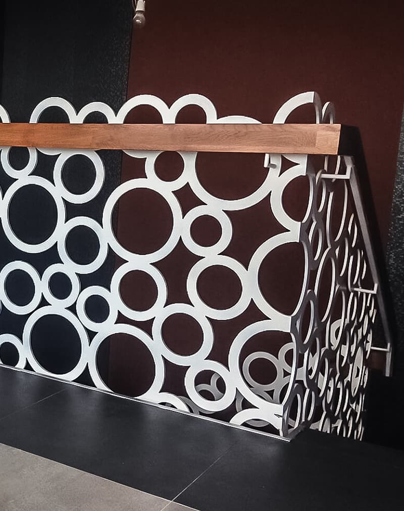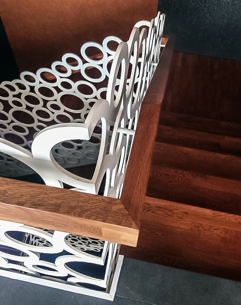 Стильные ограждения из металлического листа 8мм, на который путем лазерной резки нанесен рисунок из колец различного диаметра. Поручень из дубового бруса 100х50мм, покрытой маслом и воском.