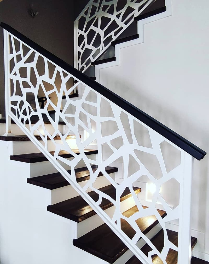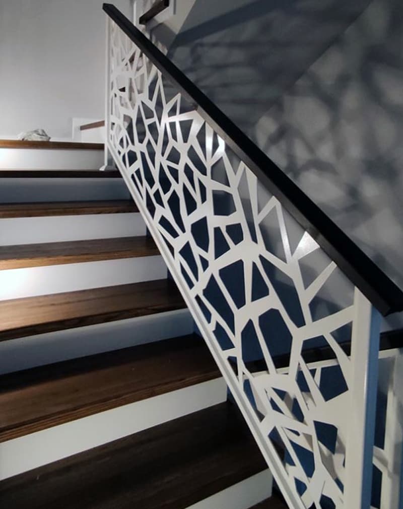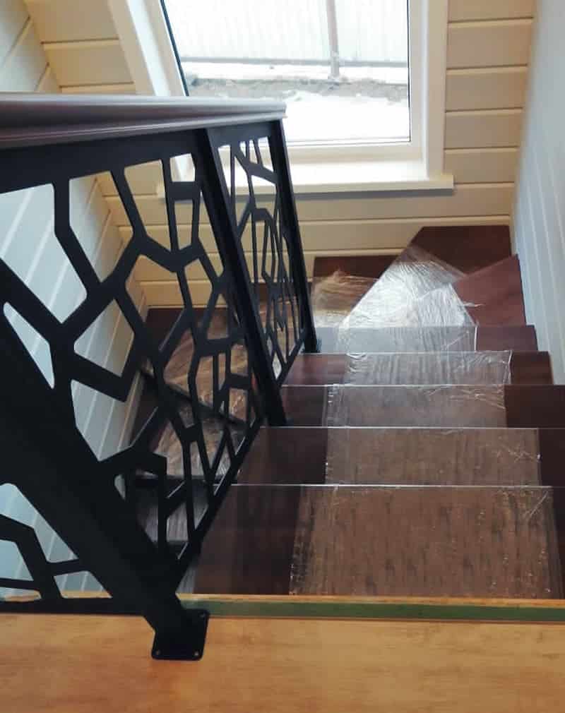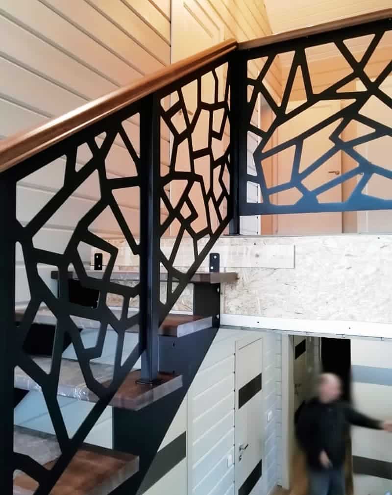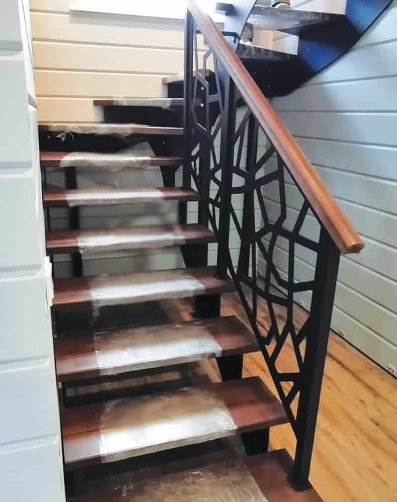 Перила сварные в лофт-стиле из металлического листа 4мм, на который путем лазерной резки нанесен хаотичный геометрический рисунок. Поручень из сосны клееной, покрытой маслом и воском. Стойки металлический профиль 40х40 мм. Крепятся на ступени лестницы.