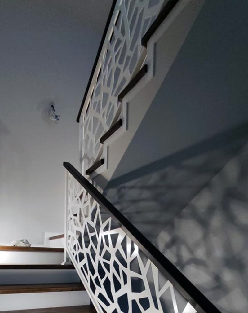 Перила металлические с деревянным поручнем. Сделаны из профиля и металлического листа 4мм с геометрическим рисунком, нанесенным лазерной резкой. Крепятся на ступени лестницы и перекрытия на стойках из профиля 40х40мм. Поручень из сосны клееной. Прекрасно подойдут к любым интерьерам — от классики до лофта. Покраска порошковая.