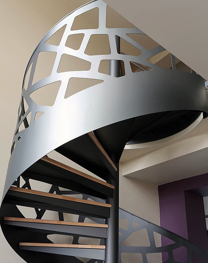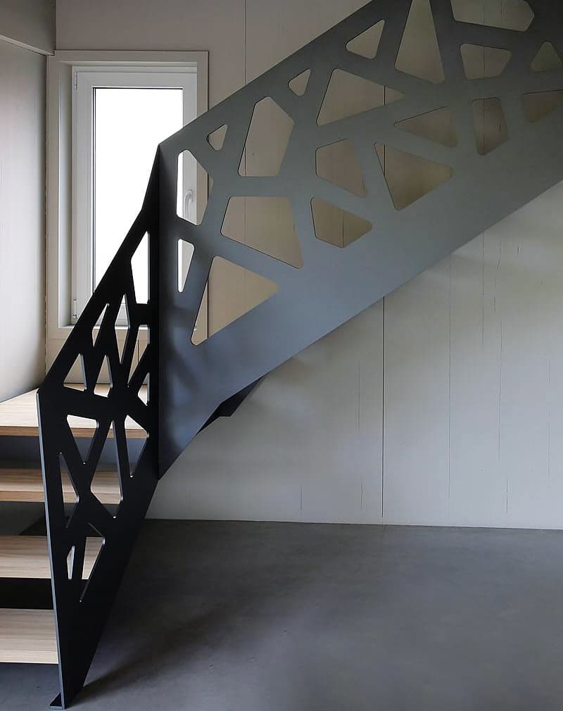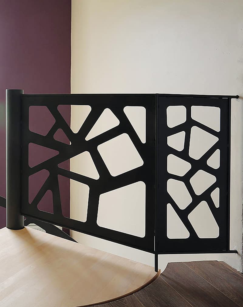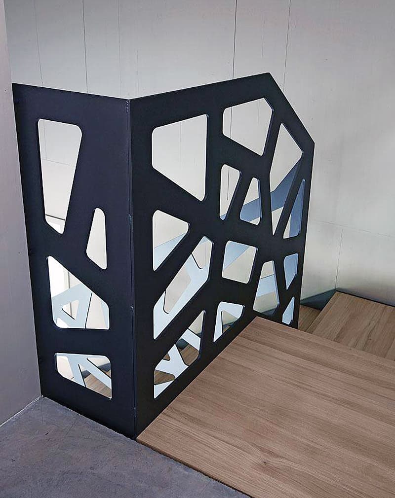 Перила сделаны из металлического листа 6мм, на котором с помощью лазерной резки нанесен рисунок в виде геометрических фигур. Поручень труба Ø20мм. Покраска порошковая или Хаммерайт.