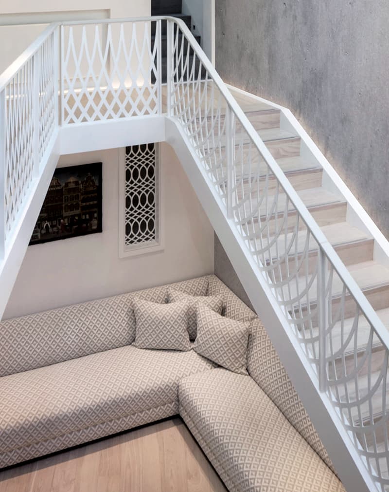 Перила в классическом стиле с пластиковым поручнем. Стойки из полос 50х10мм. Наполнение лист металлический 5мм с рисунком, нанесенным лазерной резкой. Крепятся на полосу 50х6мм. Поручень из профиля 50х25мм с пластиковой накладкой. Подойдут к любым интерьерам — классика, лофт, сканди, хай-тек. Покраска порошковая.