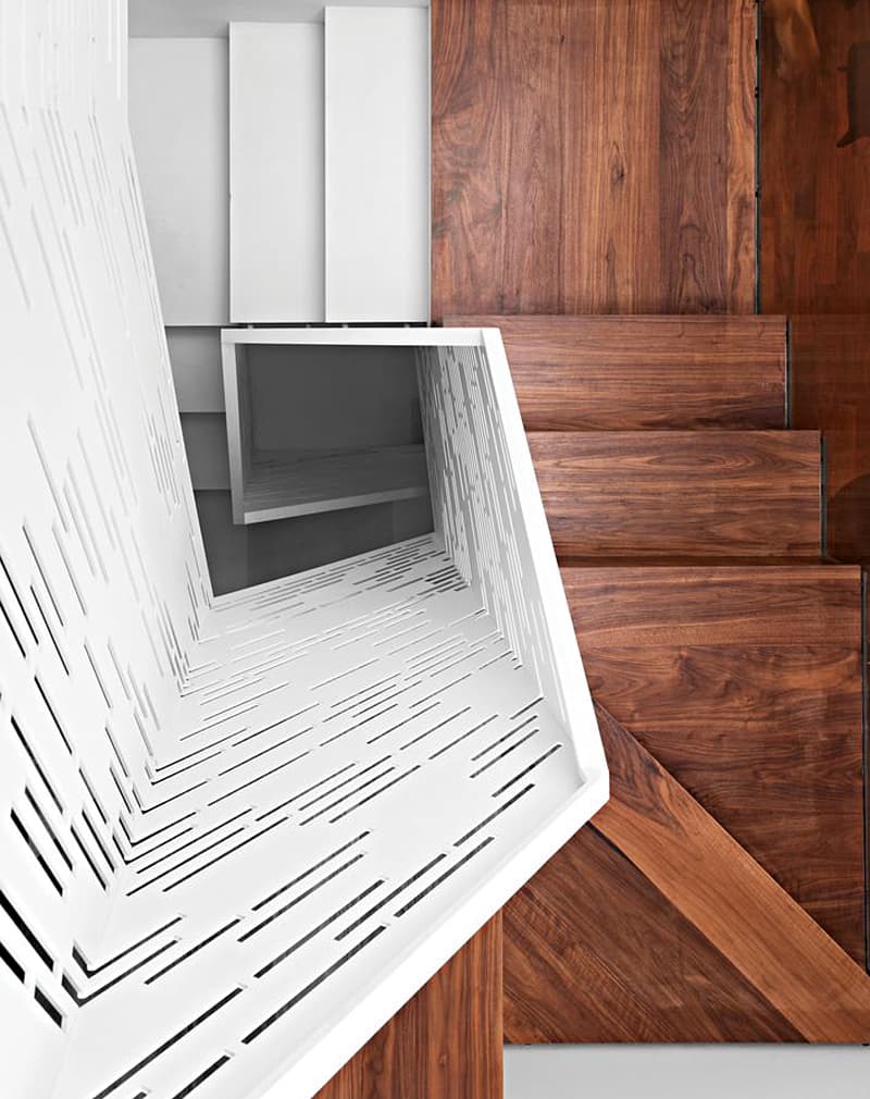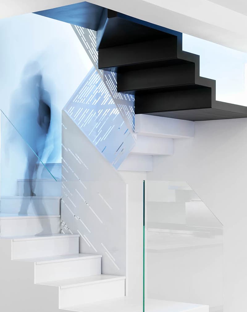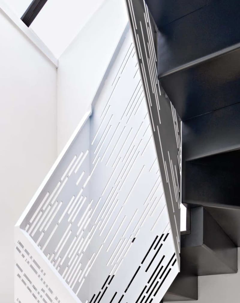 Перила сделаны из металлического листа 5мм, на котором с помощью лазерной резки нанесен рисунок в виде перфокарты. Поручень профиль металлический 40х20мм. Покраска порошковая.