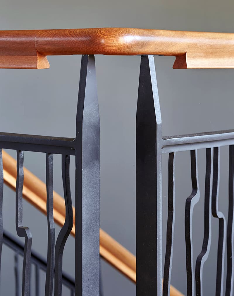 Перила сварные в лофт-стиле из металлического листа 8мм, на который путем лазерной резки нанесен вертикальный ломаный рисунок. Поручень из сосны клееной, покрытой маслом и воском. Стойки металлическая полоса 50х10 мм.