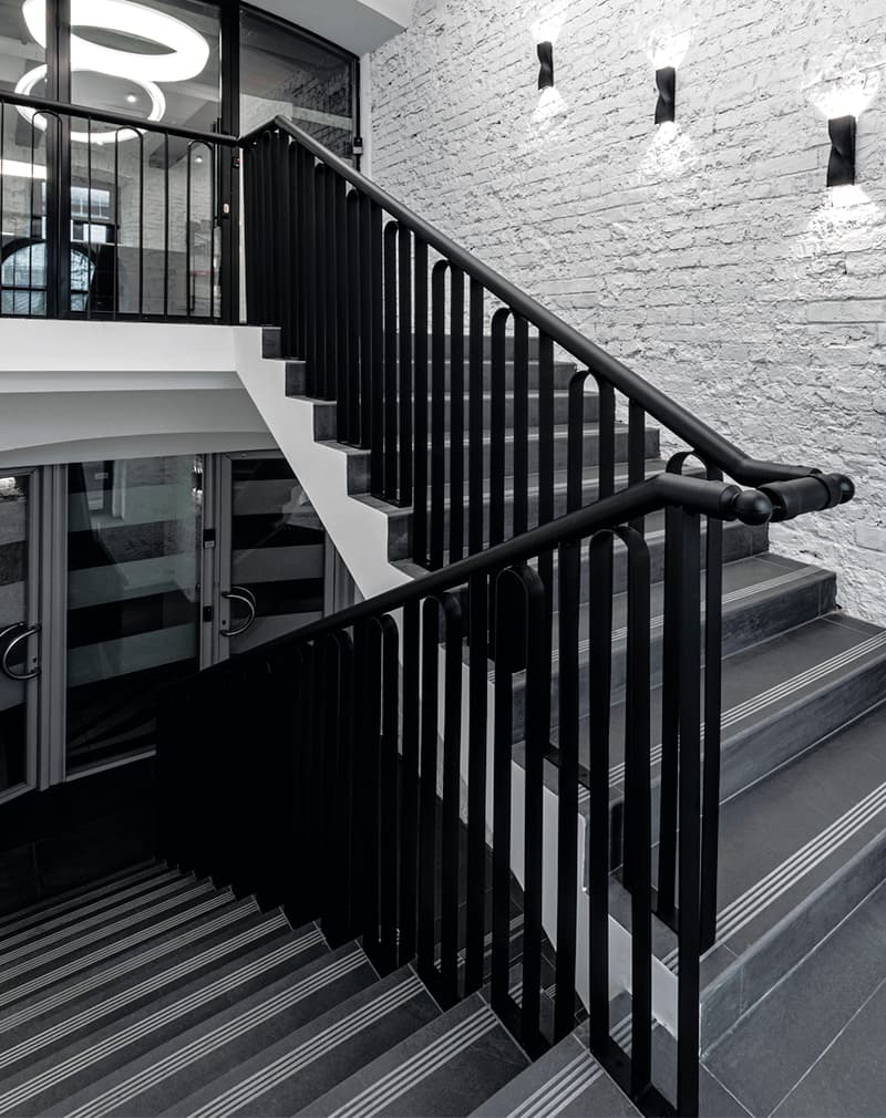 Перила лофт сварные из металлической полосы. Внутренний рисунок арочного типа в модерновом ключе. Поручень из трубы ⌀50мм. Покраска порошковая.